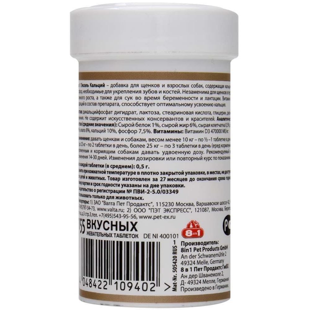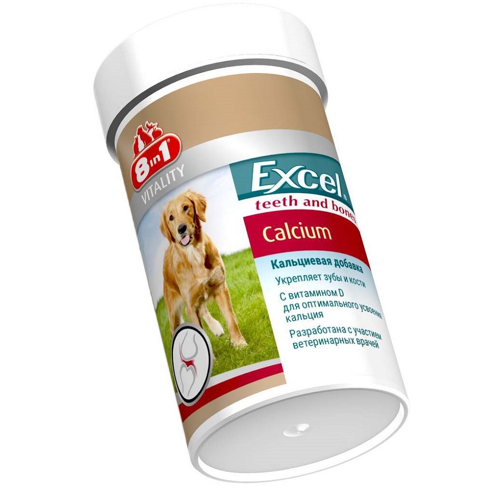 8in1 Excel Calcium — добавка для щенков и взрослых собак, содержащая кальций и фосфор, необходимые для укрепления зубов и костей. Незаменима для щенков в период активации роста, а также для