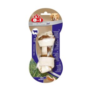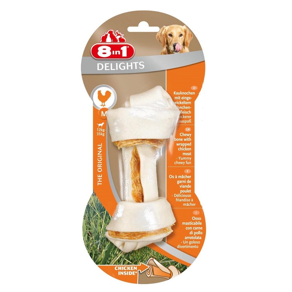 Косточка 8 in 1 Delights M — лакомство для собак средних и крупных пород. Аппетитное куриное мясо, завернутое в жесткую говяжью кожу высшего качества.