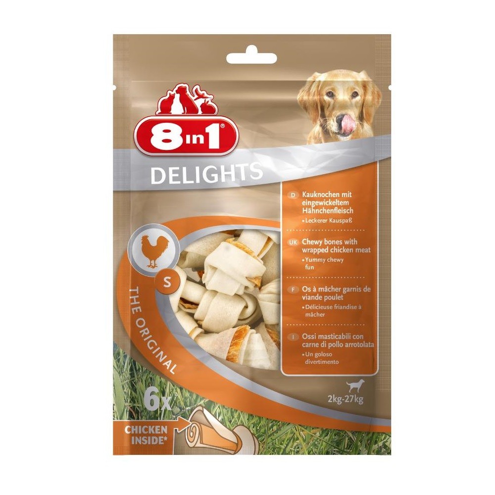 8 in 1 Delights S — аппетитное куриное мясо, завернутое в жесткую говяжью кожу высшего качества для собак мелких и средних пород. Уникальное сочетание жевательной косточки и средства