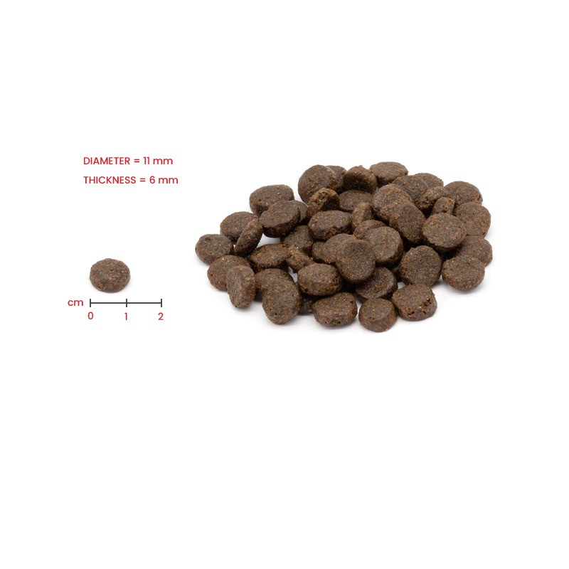 Сырой протеин – 36,00%, сырой жир – 20,00%, сырая клетчатка – 1,40%, влага – 9,00%, сырая зола – 8,70%, крахмал – 22,00%, Кальций – 1,70%, Фосфор – 1,30%, Натрий – 0,70%, Омега-6 – 1,70%, Омега-3 –