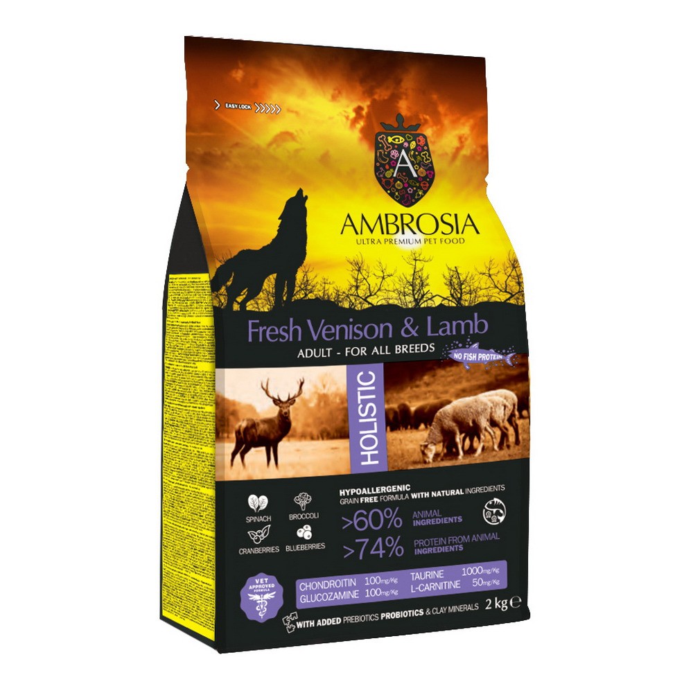 Ambrosia Grain Free Adult Fresh Venison & Lamb — это превосходный беззерновой корм, предлагающий оптимальное питание для собак всех пород. Насыщен белком, поступающим из свежей оленины и