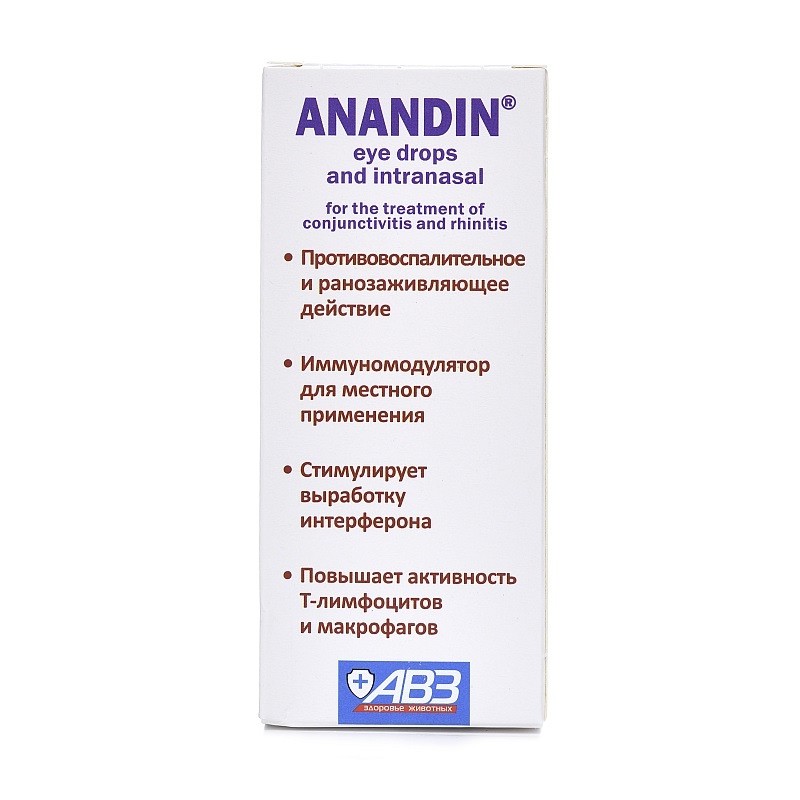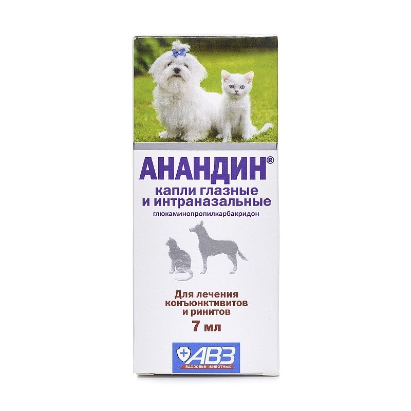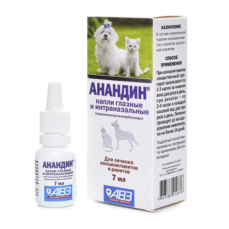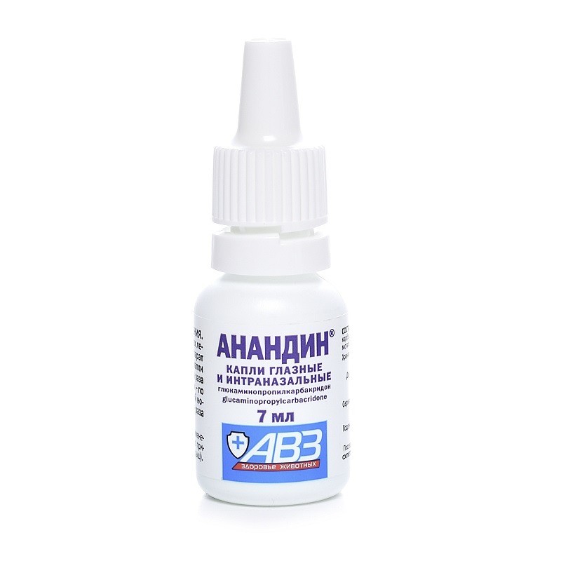 Капли глазные и интраназальные Анандин в 1 мл содержат глюкаминопропилкарбакридон (анандин) — 20 мг. Применяют в комплексной терапии конъюнктивитов и ринитов различной этиологии у собак и кошек.