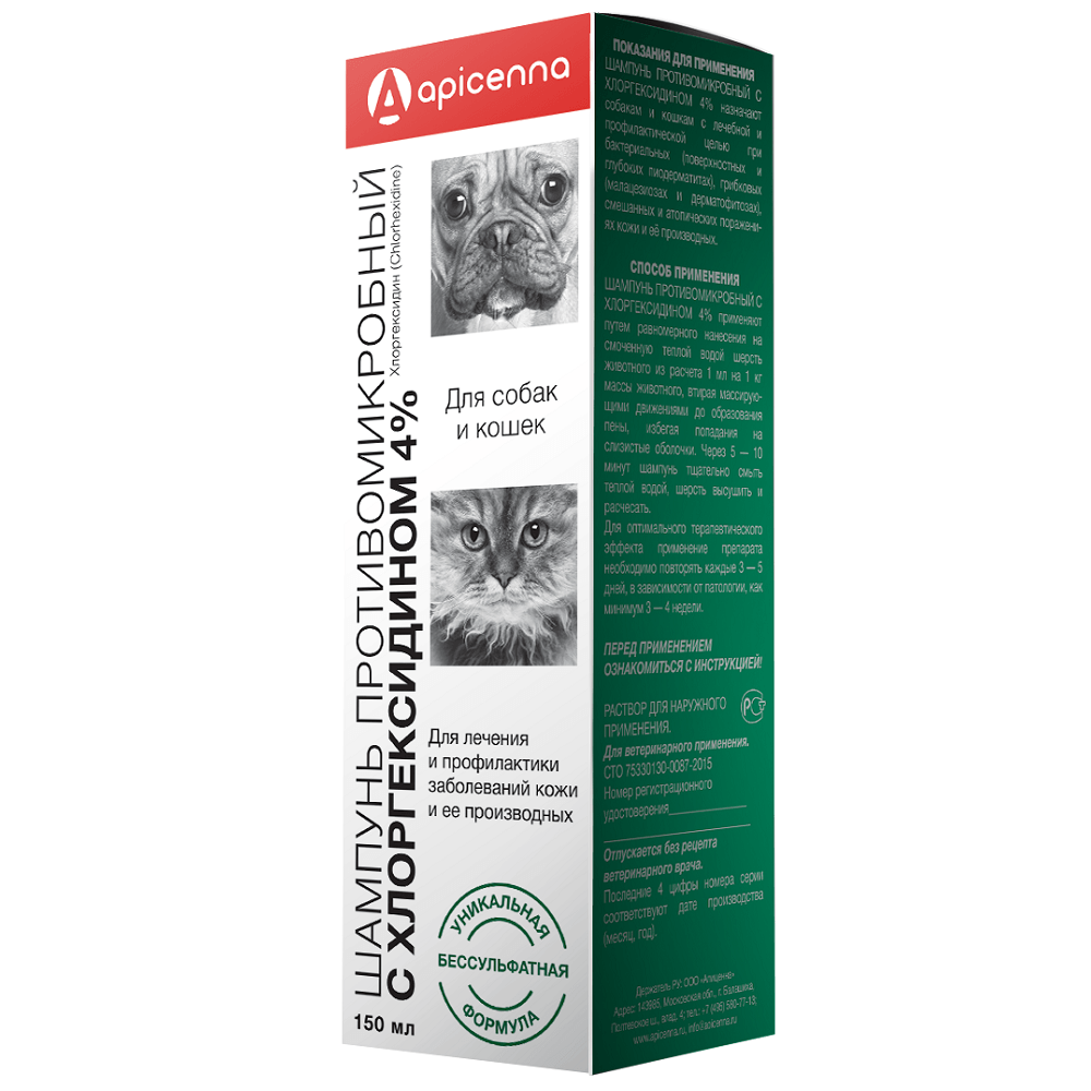 Apicenna Шампунь с хлоргексидином 4% — препарат для лечения и профилактики заболеваний кожи и ее производных у животных.