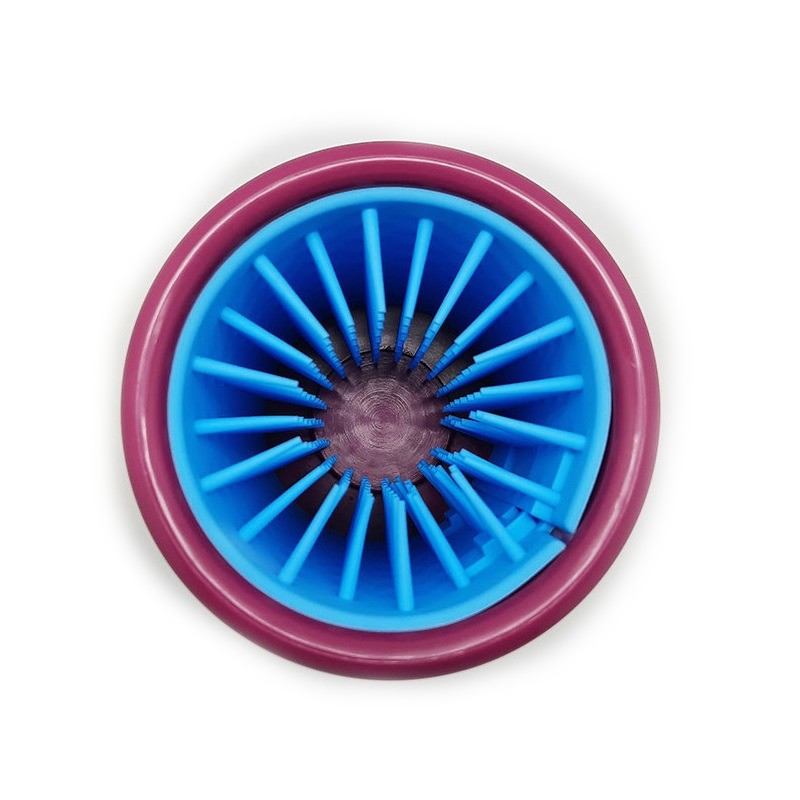 Лапомойка состоит из пластмассового стакана, в который вставляется щётка с силиконовыми ворсинками. Добавьте в воду каплю шампуня или мыльного раствора, а после процедуры насухо вытрите собаке