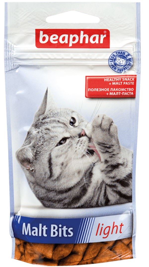 Подушечки Malt Bits light содержат на 50% меньшее количество жиров по сравнению с Malt Bits и без сахара, поэтому отлично походят кошкам, склонным к лишнему весу.