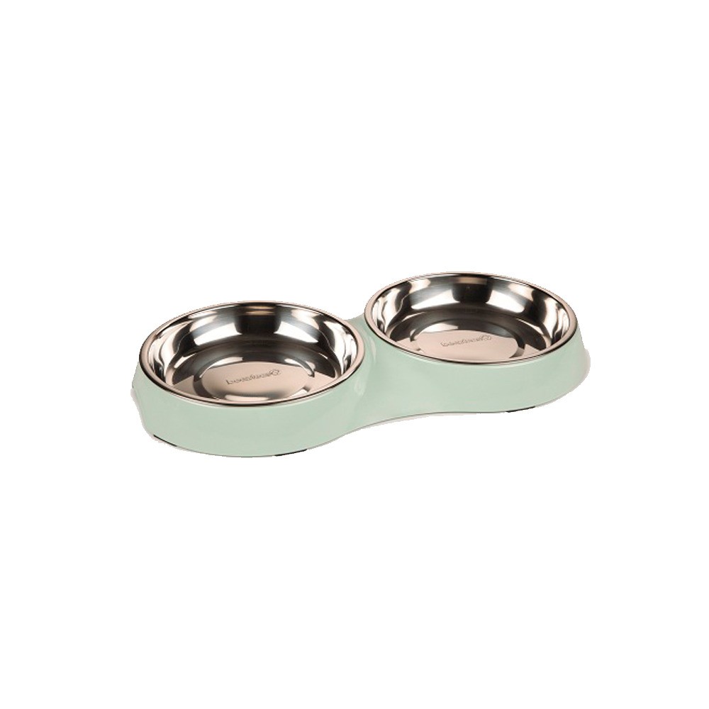 Меламин — это высококачественный синтетический материал, который легко мыть. Набор имеет две съемные миски из нержавеющей стали.