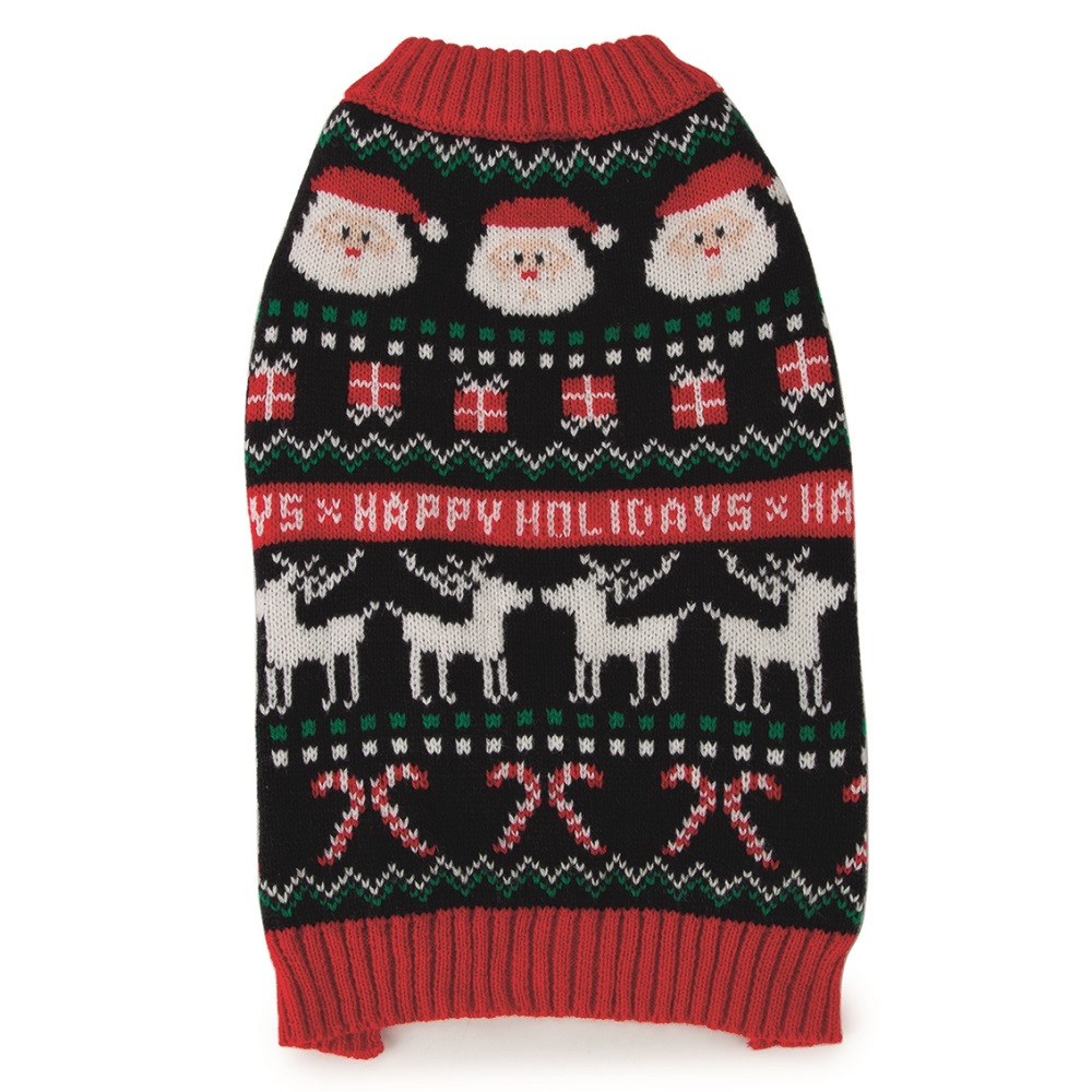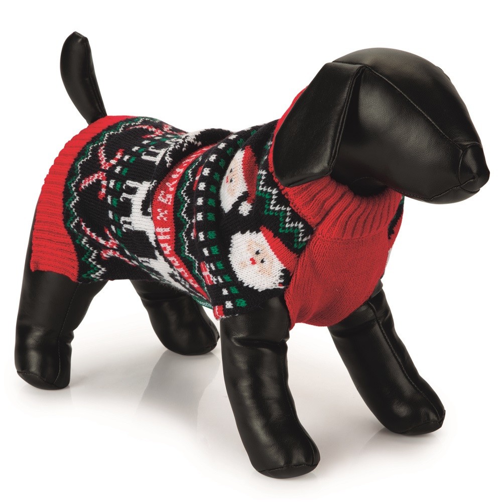 Beeztees Happy Holiday — свитер для собак, который украшен рождественским мотивом: Санта-Клаусом, северными оленями и подарками.