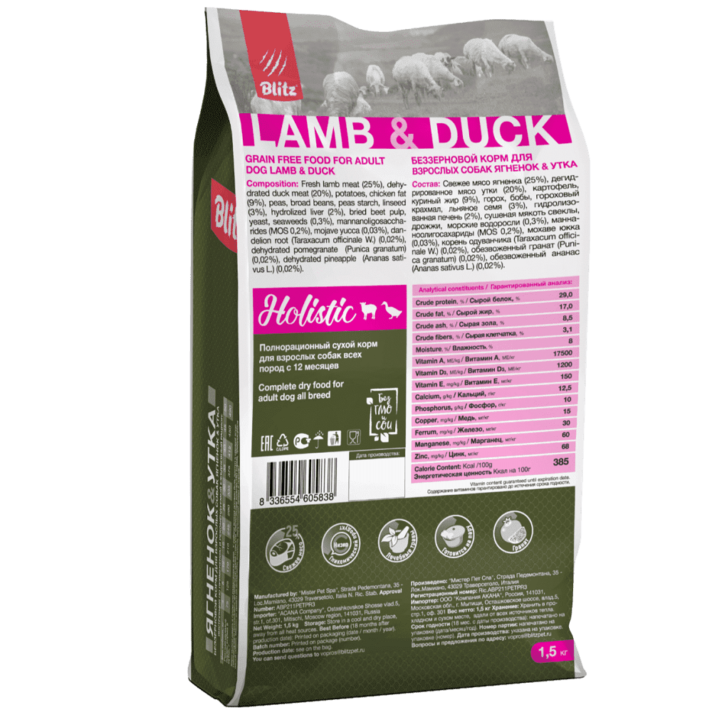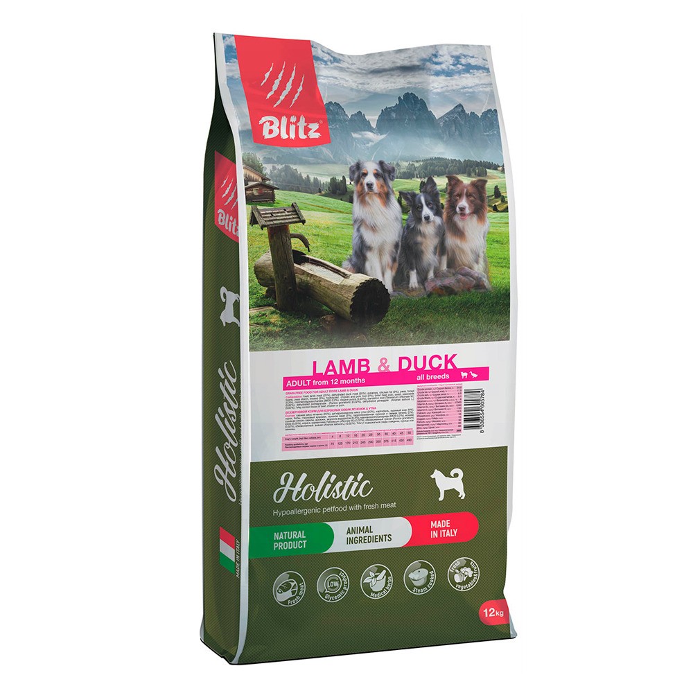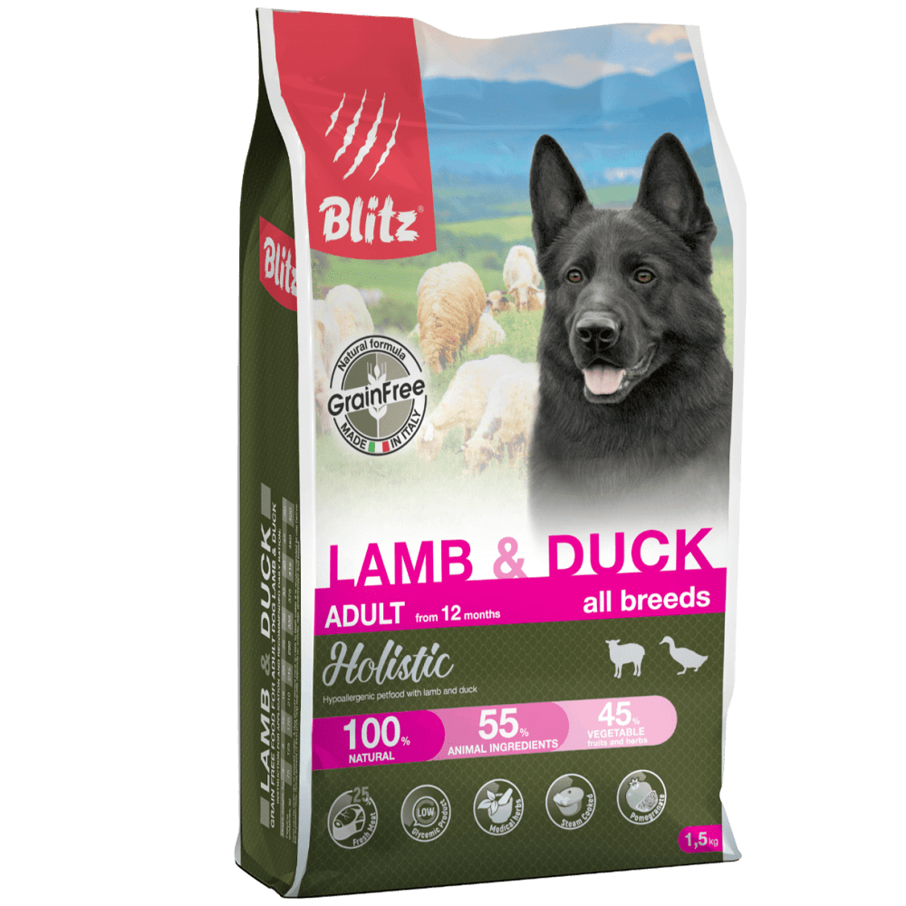 Blitz Holistic Grain Free Lamb & Duck Adult Dog All Breeds — беззерновой полнорационный корм для взрослых собак всех пород на основе ягнёнка и утки — самых низкоаллергенных видов мяса, обладающих к