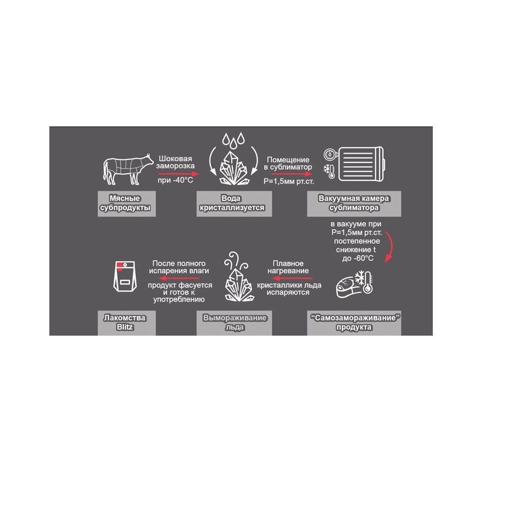 эквивалентно 200-240 г свежего мясного сырья. Удаление влаги из исходного продукта происходит в вакуумной сублимационной камере, поэтому наше сушёное говяжье вымя практически полностью