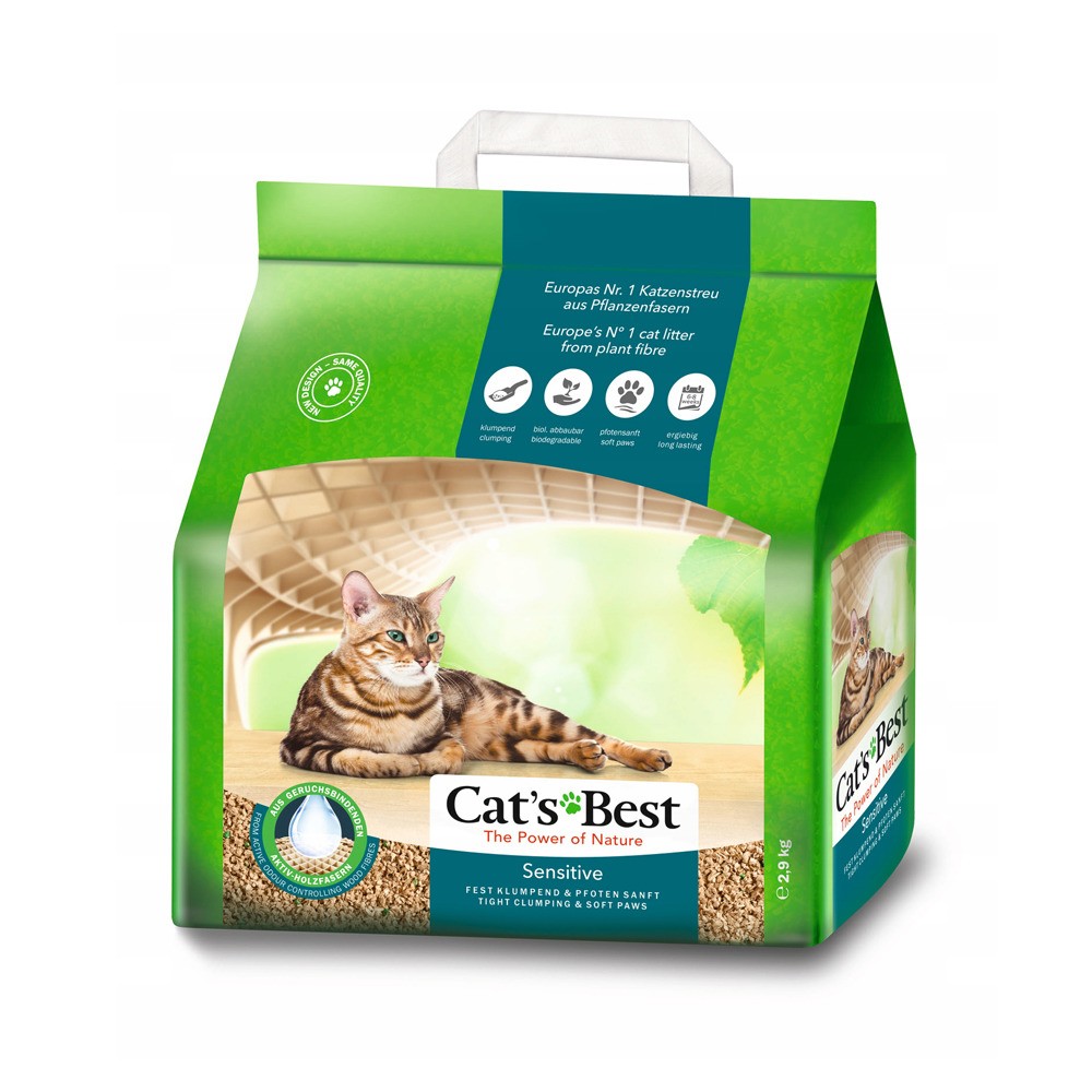 Cat’s Best Sensitive — это древесный комкующийся наполнитель с антибактериальной добавкой, изготовленный на 100 % из волокон растительного самовоспроизводящегося сырья. Наполнитель специально