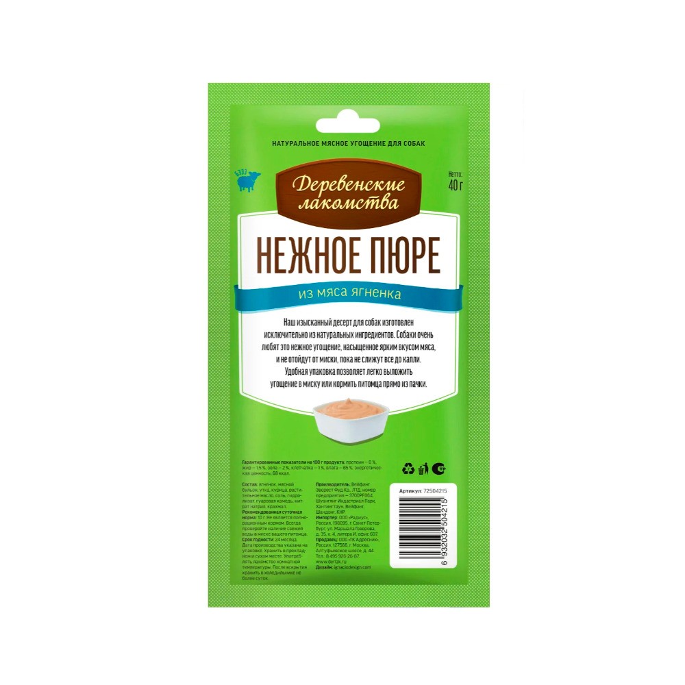 Нежное пюре Деревенские лакомства — изысканный десерт для собак. Изготовлено исключительно из натуральных ингредиентов. Собаки очень любят это нежное угощение с ярким вкусом мяса и не отойдут
