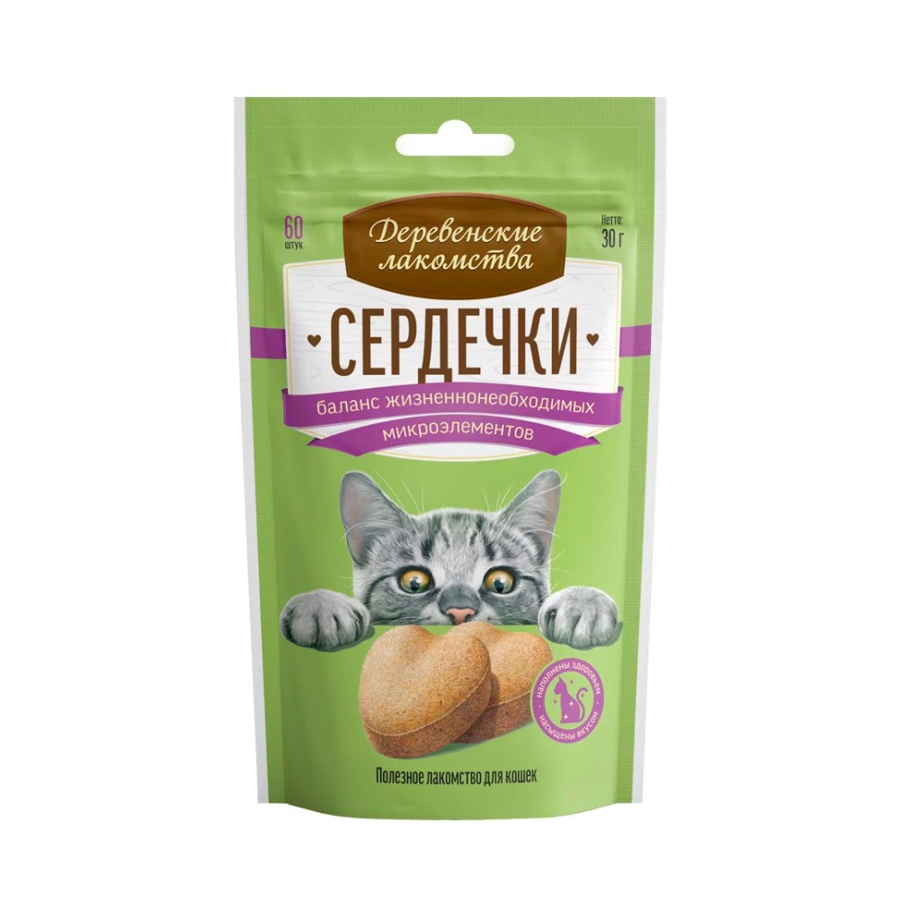 Деревенские лакомства Сердечки для баланса микроэлементов — уникальный рецепт этого лакомства содержит все необходимые микроэлементы для поддержания крепкого здоровья кошки. А ещё оно очень