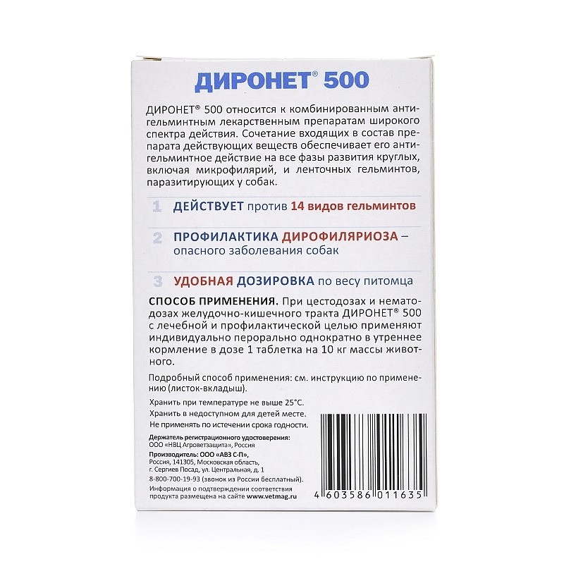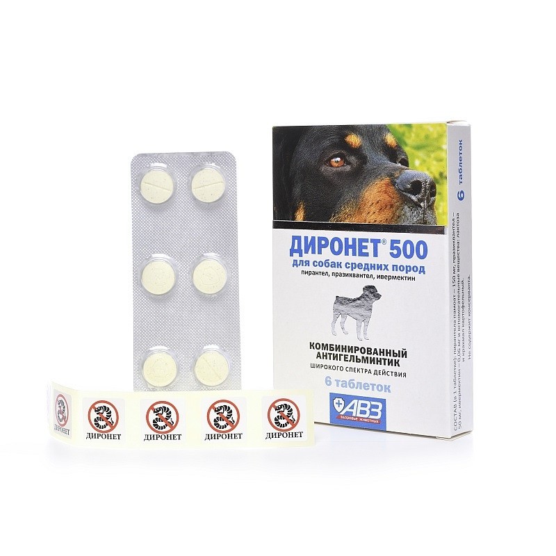 Диронет® 500 таблетки для собак средних пород в качестве действующих веществ в 1 таблетке содержат пирантела памоат – 150 мг, празиквантел – 50 мг и ивермектин – 0,06 мг, а также вспомогательные