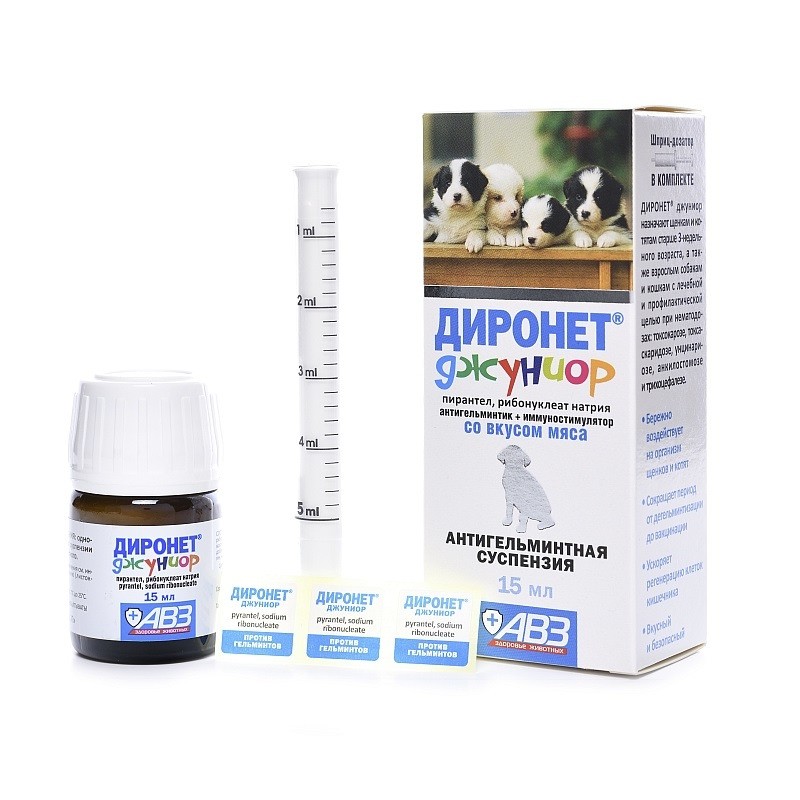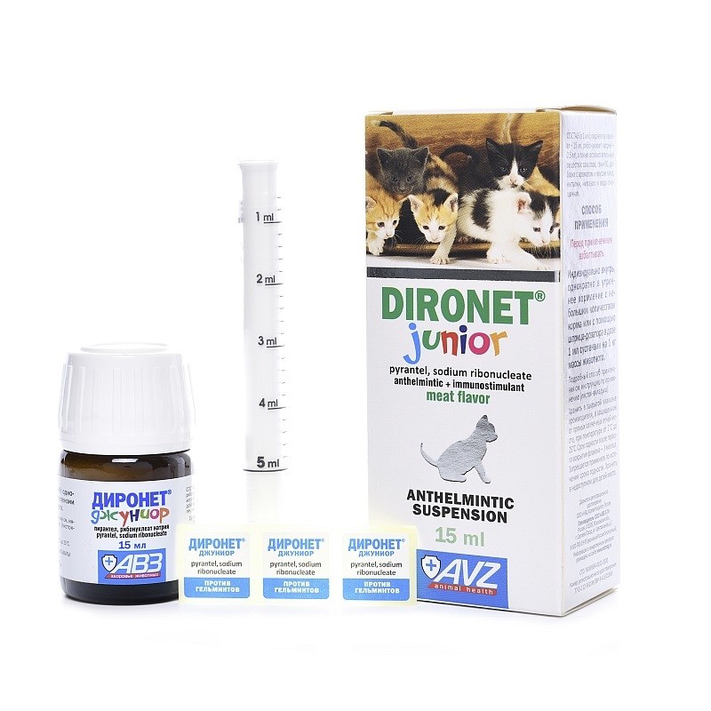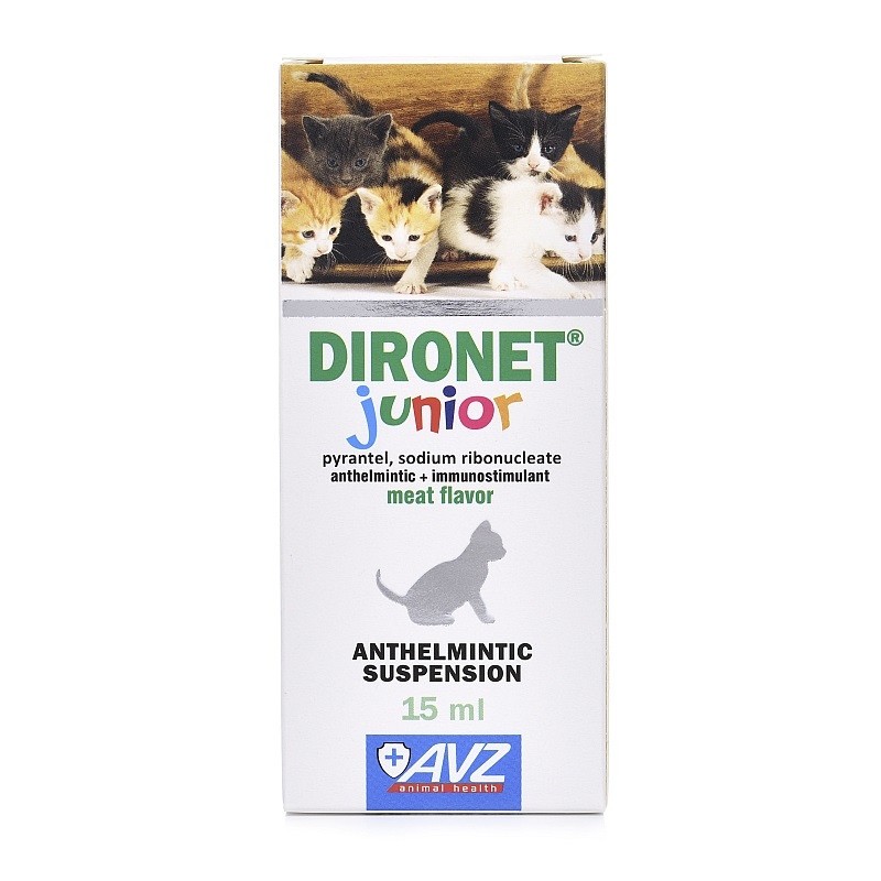 Диронет Джуниор назначают щенкам и котятам старше 3-недельного возраста, а также взрослым собакам и кошкам с лечебной и профилактической целью при нематодозах: токсокарозе, токсаскаридозе,