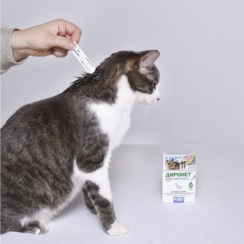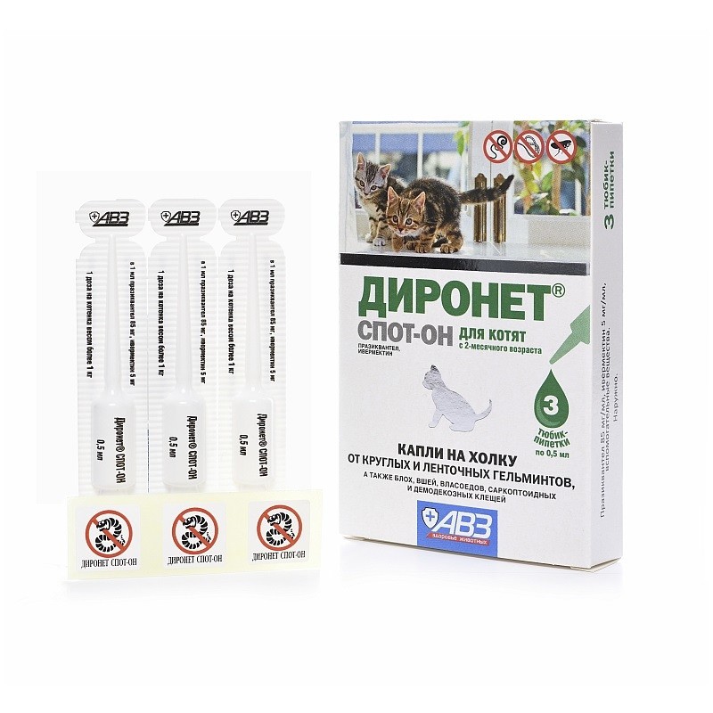 Диронет Спот-Он назначают котятам старше 2-месячного возраста с целью лечения и профилактики кишечных нематодозов, цестодозов, энтомозов, отодектоза, саркоптоза, нотоэдроза и демодекоза.