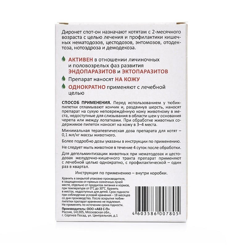 «Диронет Спот-Он» обладает широким спектром противопаразитарного действия, активен в отношении личиночных и половозрелых фаз развития кишечных нематод, включая Toxocara canis, Toxocara cati,