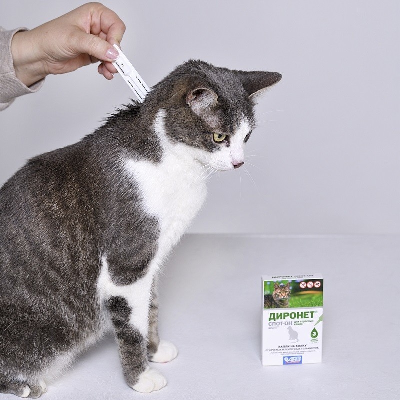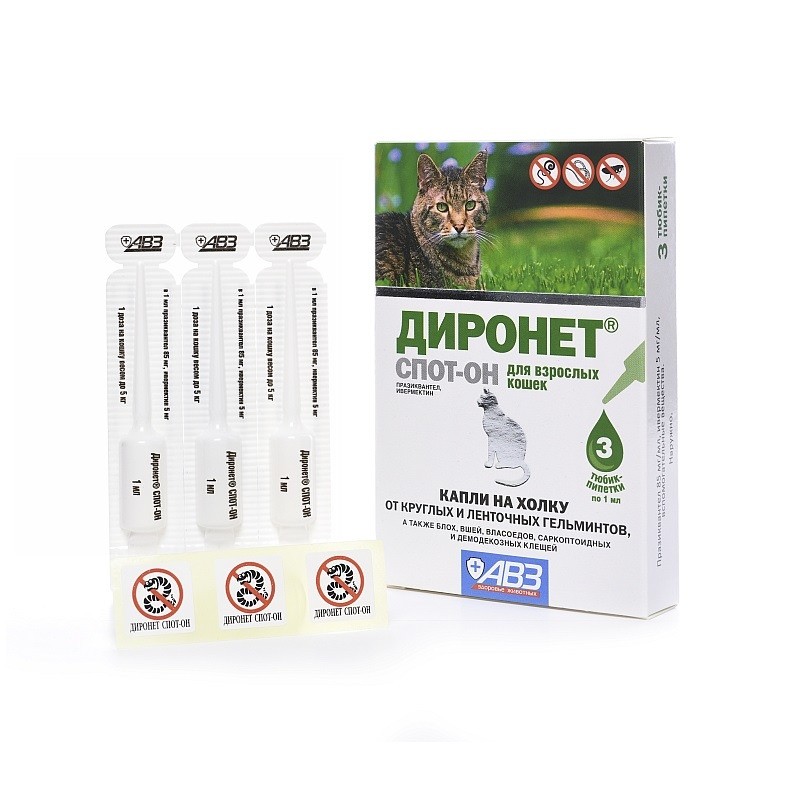 Диронет Спот-Он назначают взрослым кошкам с целью лечения и профилактики кишечных нематодозов, цестодозов, энтомозов, отодектоза, саркоптоза, нотоэдроза и демодекоза.