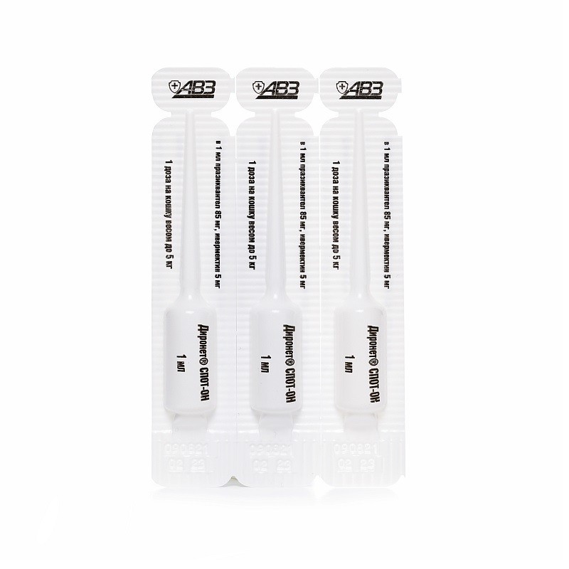 «Диронет Спот-Он» для кошек расфасовывается по 1 мл в полимерные тюбик-пипетки, которые упакованы по 3 штуки в картонные пачки.