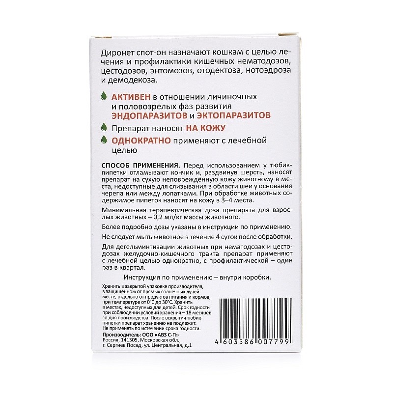 «Диронет Спот-Он» обладает широким спектром противопаразитарного действия, активен в отношении личиночных и половозрелых фаз развития кишечных нематод, включая Toxocara canis, Toxocara cati,