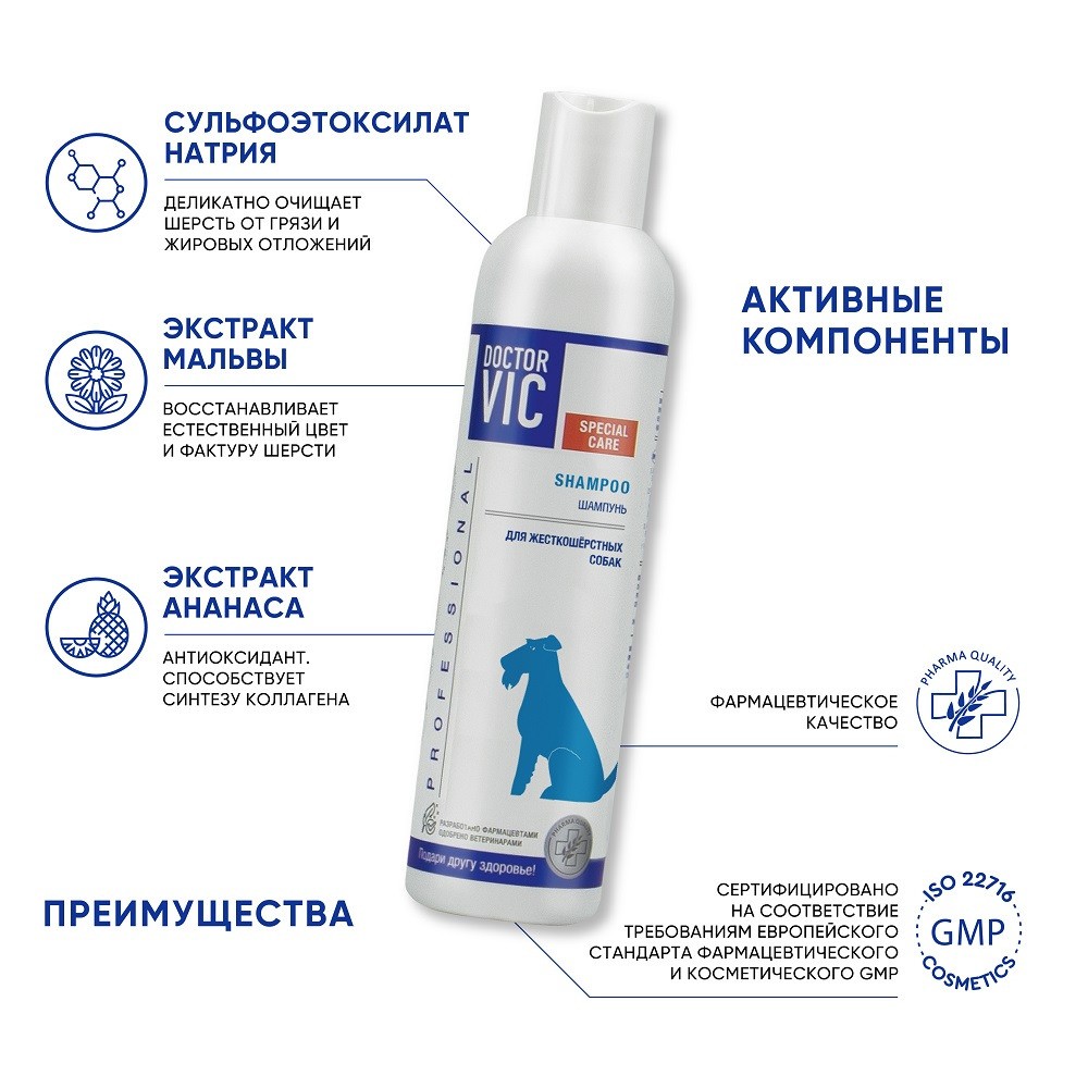 DOCTOR VIC Шампунь — это специальный шампунь для собак со средней, жёсткой и грубой структурой шерсти.