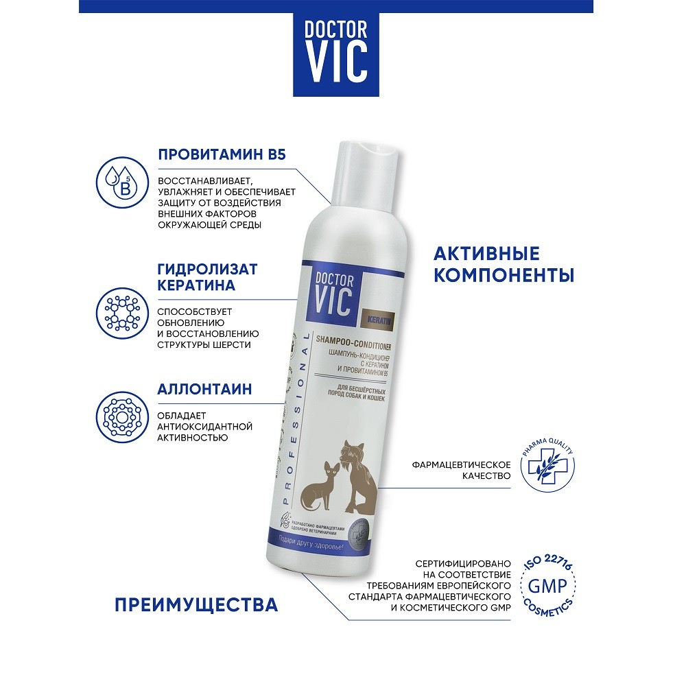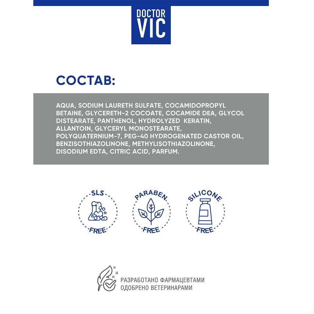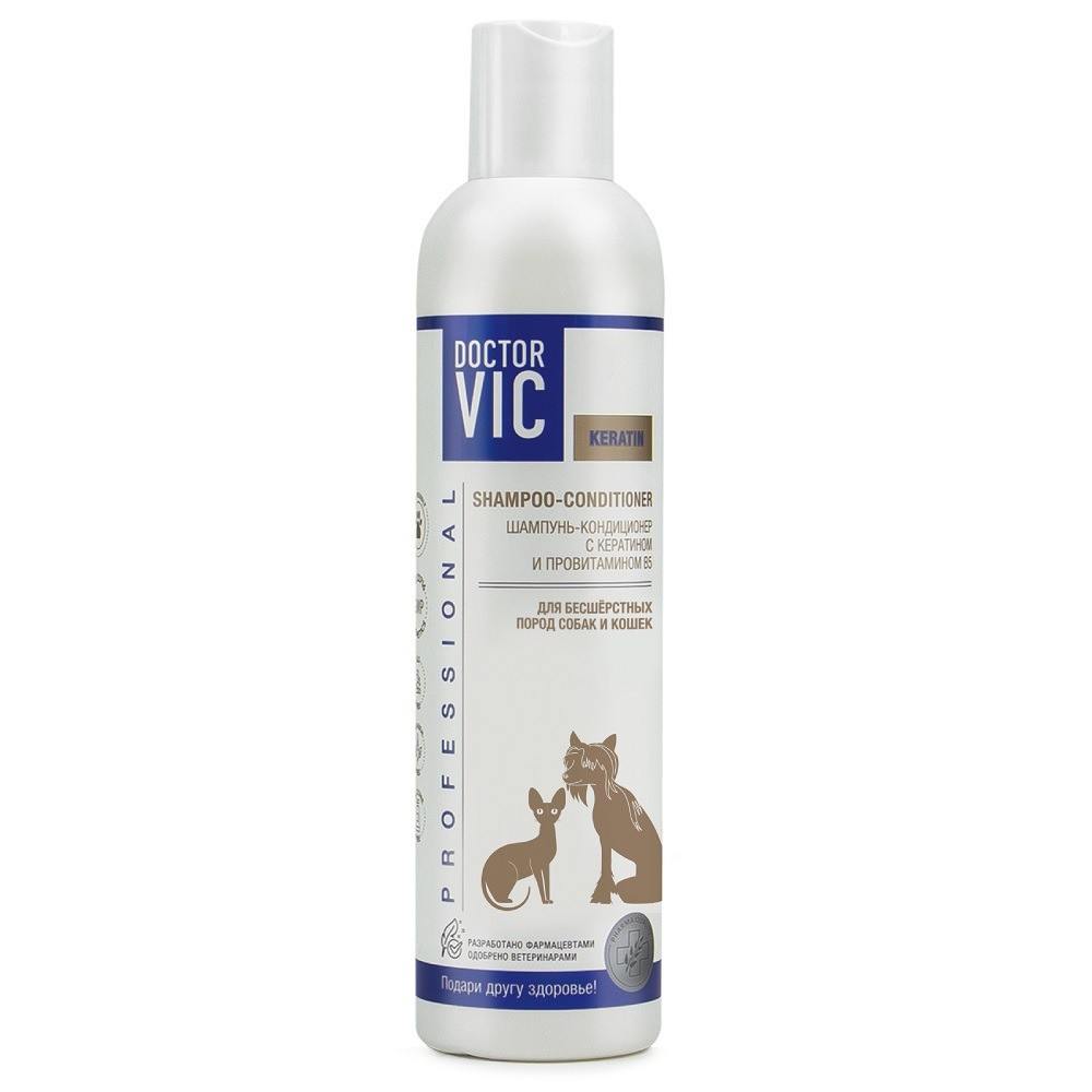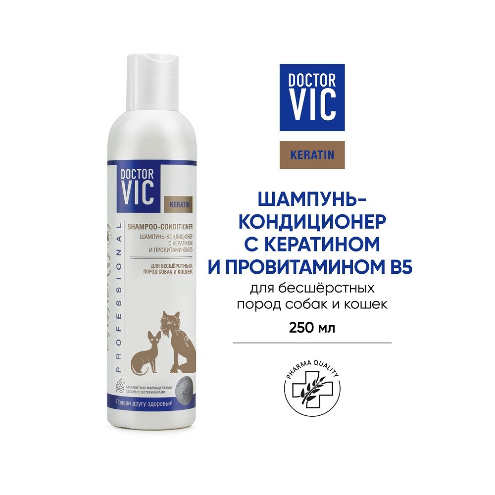 DOCTOR VIC Шампунь-кондиционер для бесшерстных кошек (сфинксов) и собак — это шампунь-кондиционер, обогащенный кератином и провитамином В5.