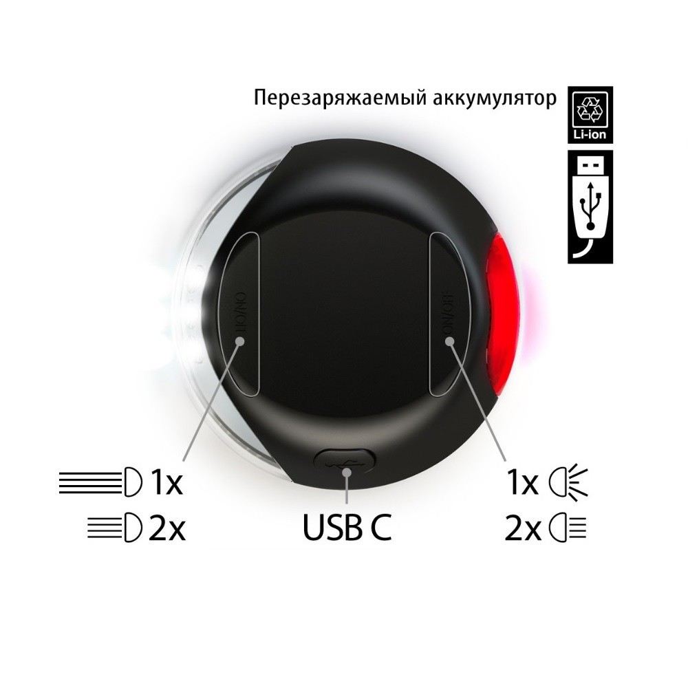 Отличное решение для ночных прогулок. Сверхъяркий светодиодный передний фонарь с отдельным задним красным фонарем. Оба могут включаться и выключаться по отдельности. Система может быть прикреплена