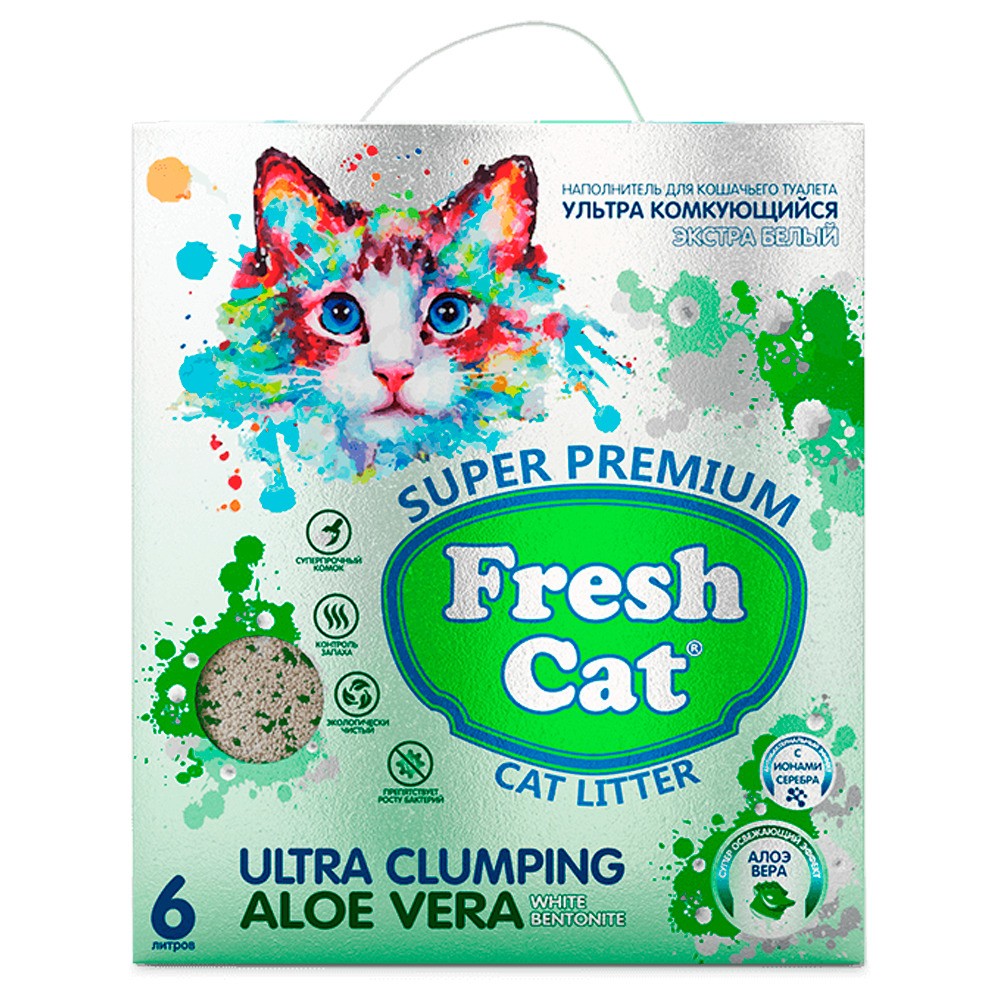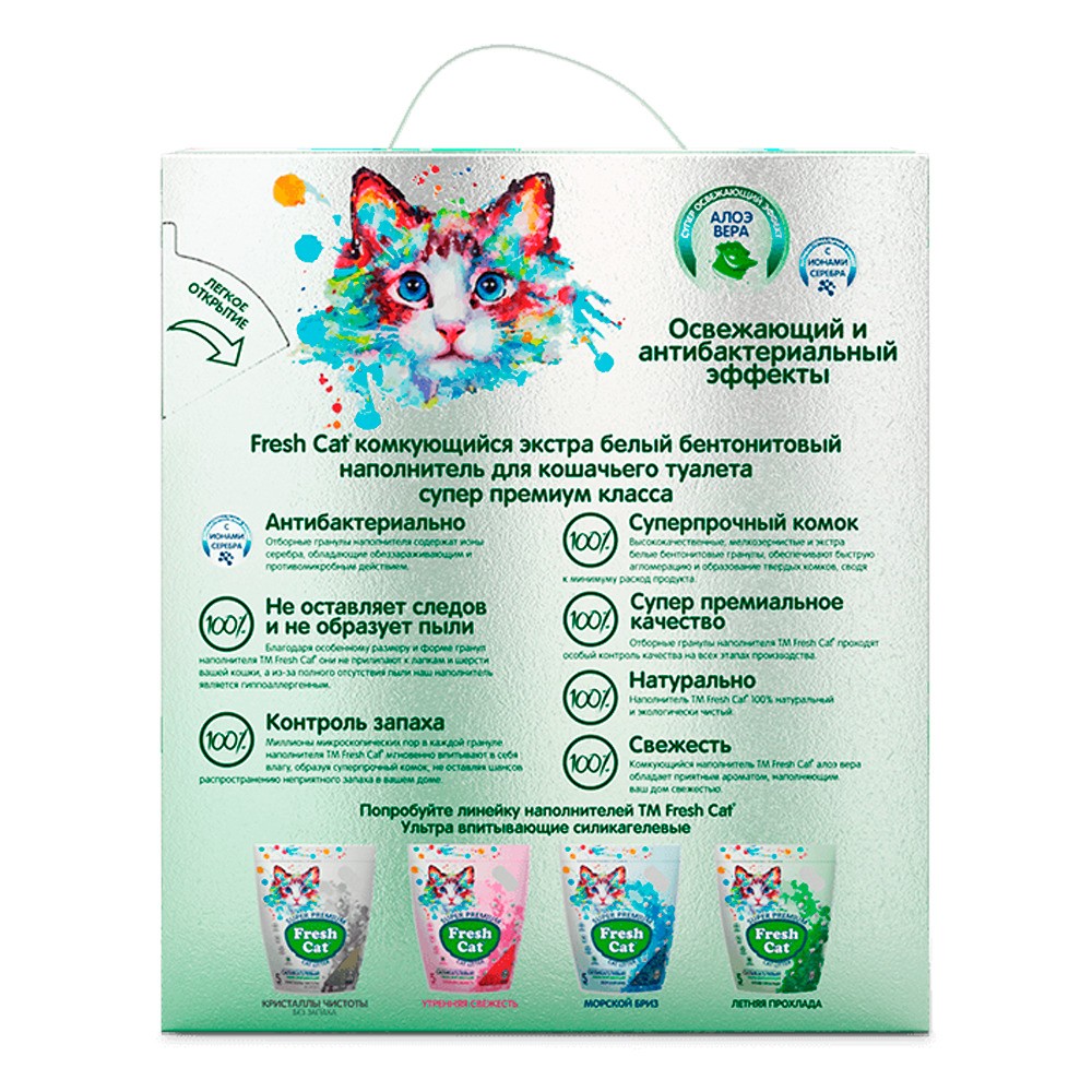 • Свежесть: Комкующийся наполнитель ТМ Fresh Cat с ароматом «Алоэ веры» поглощает неприятные запахи, наполняя ваш дом свежестью!