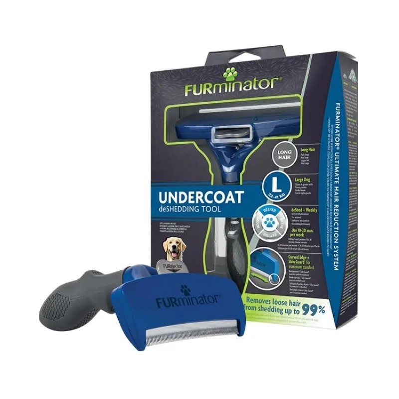 FURminator L для крупных собак (23-41 кг) с длинной шерстью (более 5 см) — уникальное лезвие захватывает и вытаскивает мертвые волоски подшерстка до их выпадения, сокращая линьку до 99%.