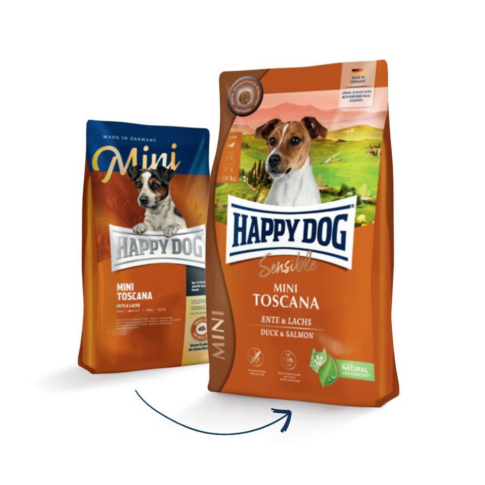 Happy Dog Sensible Mini Toscana — безглютеновый сухой корм в средиземноморском стиле с лососем и уткой для кастрированных/стерилизованных собак мелких пород (до 10 кг).