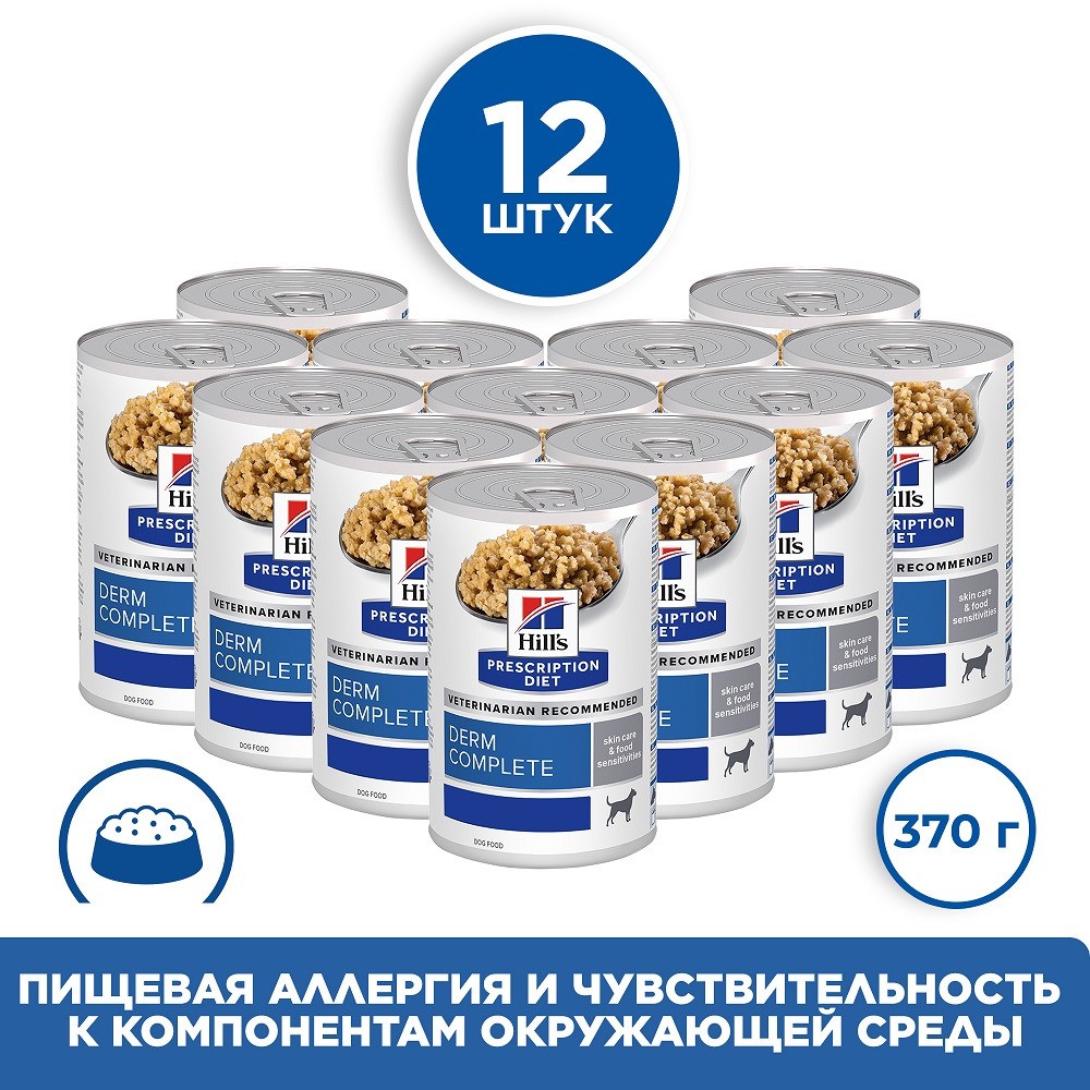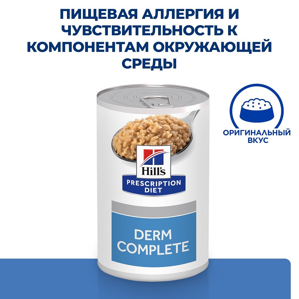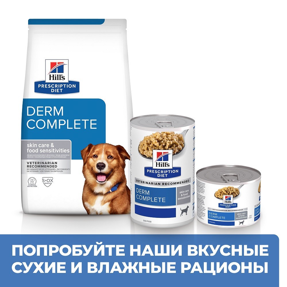 Консервированный диетический корм для собак Hill’s Prescription Diet Derm Complete обеспечивает все необходимое для питания вашей собаки и может использоваться в течение длительного времени.