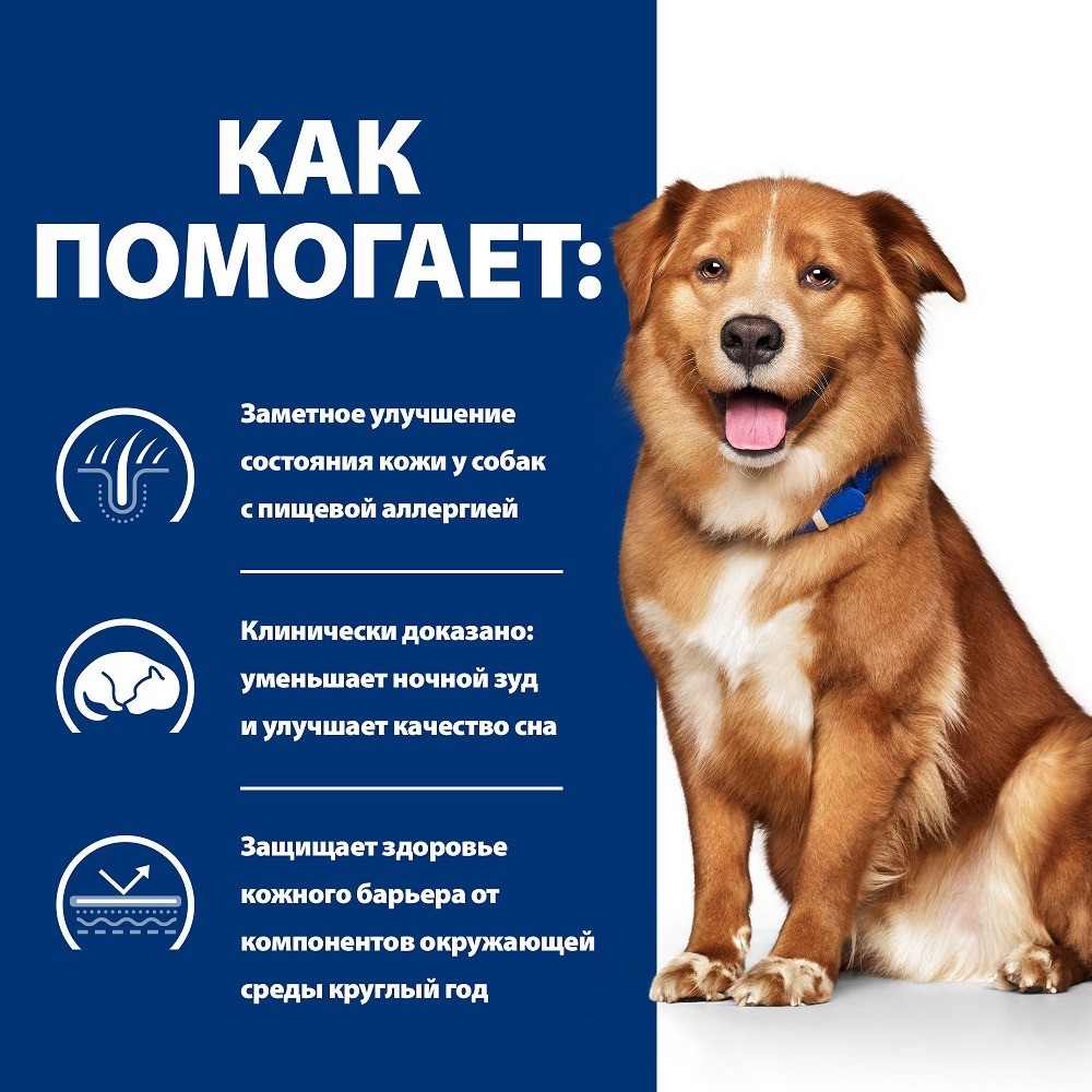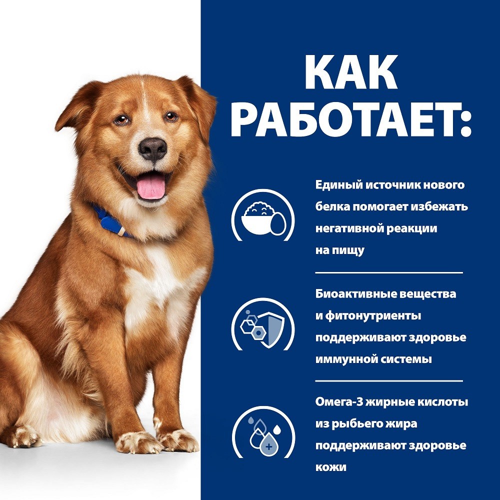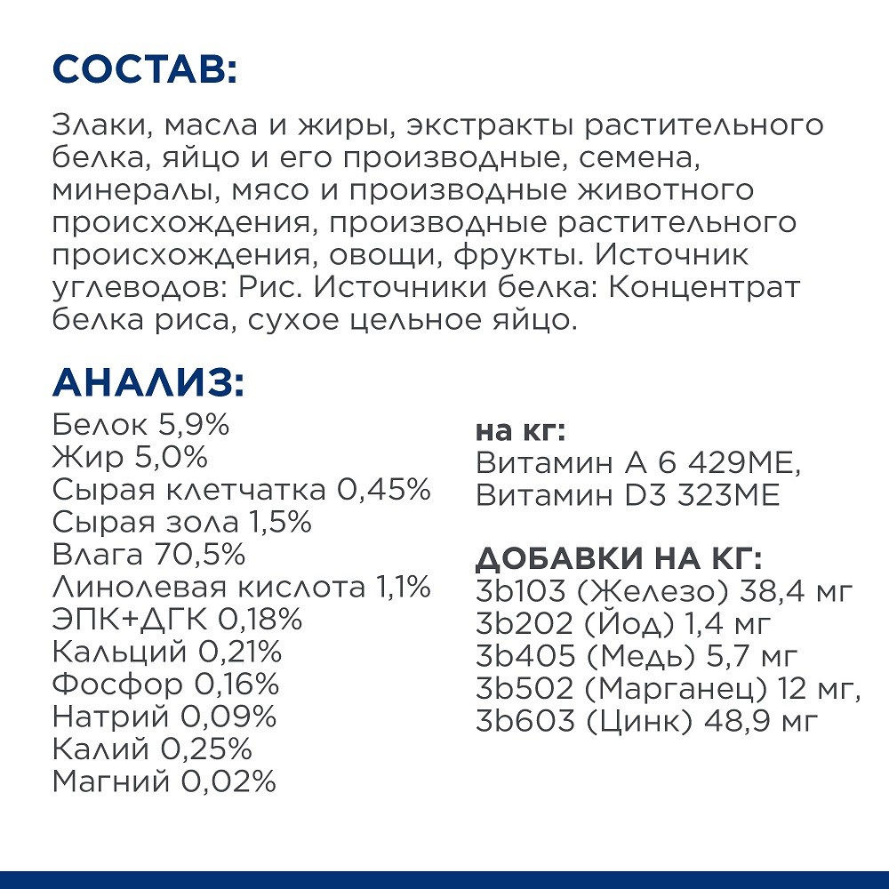 непереносимости ингредиентов и питательных веществ у взрослых собак. Корм содержит высокие уровни линолевой кислоты (ЛК), а также суммы эйкозапентаеновой кислоты (ЭПК) и докозагексаеновой кислоты