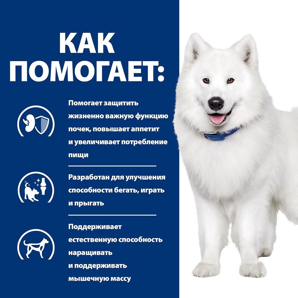 Hill’s Prescription Diet k/d + Mobility Kidney + Joint Care — полноценный диетический корм для взрослых собак, предназначенный для поддержки функции почек при хронической или временной почечной