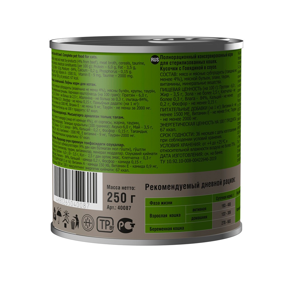 Мясо и мясные субпродукты (говядина не менее 4%), мясной бульон, злаки, таурин, витамины, минеральные вещества.