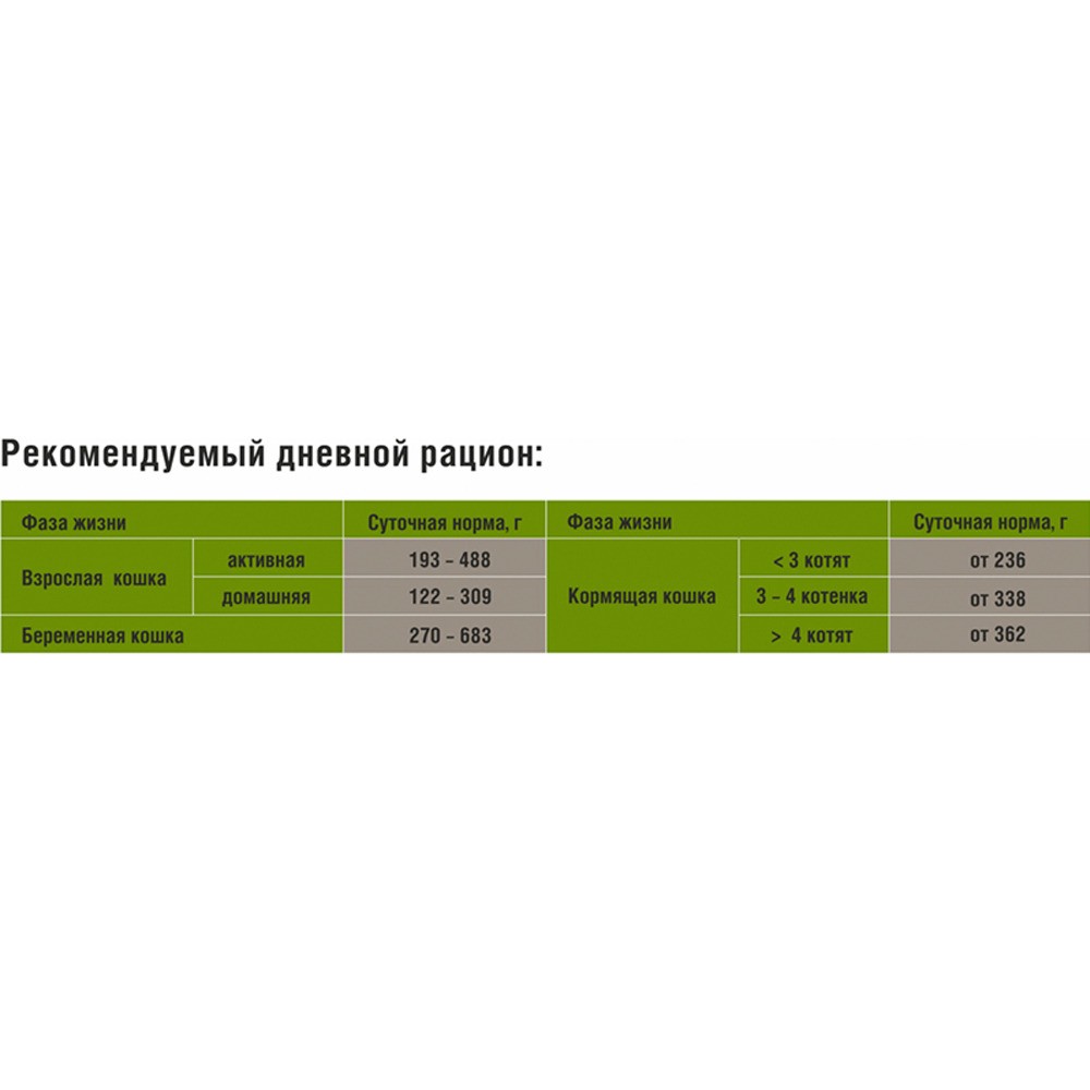 Протеин — 6,0 г, Жир — 3,5 г, Зола — не более 2,5 г, Клетчатка — не более 0,3 г, Влага — 84%, Кальций — не менее 0,2 г, Фосфор — не менее 0,15 г.