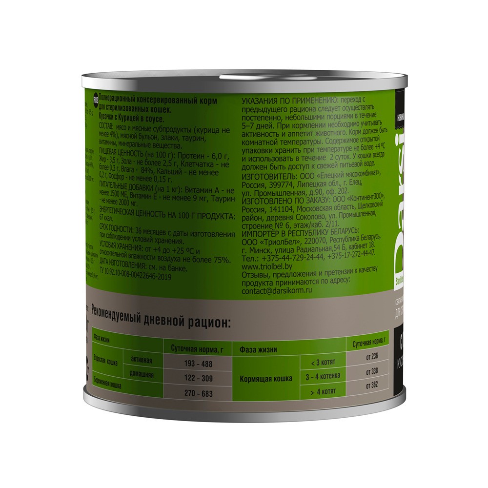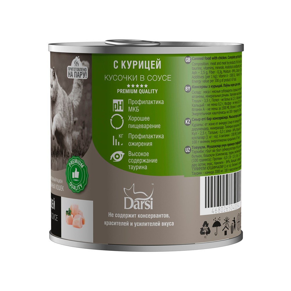 Darsi Консервы для стерилизованных кошек «Кусочки с Курицей в соусе» — влажный корм в виде кусочков в соусе с мясом курицы.