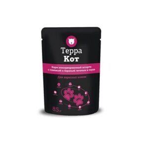 Мясо и мясные субпродукты (курица не менее 4%), мясной бульон, злаки, таурин, витамины, минеральные вещества. Питательные добавки (на 1 кг): Витамин А — не менее 150 МЕ, Витамин Е — не менее 0,9