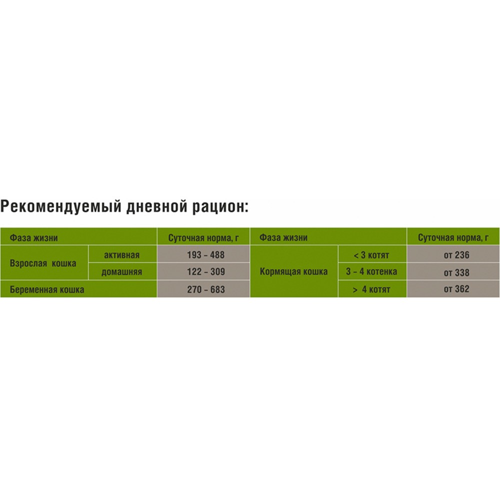Протеин — 6,0 г, Жир — 3,5 г, Зола — не более 2,5 г, Клетчатка — не более 0,3 г, Влага — 84%, Кальций — не менее 0,2 г, Фосфор — не менее 0,15 г.