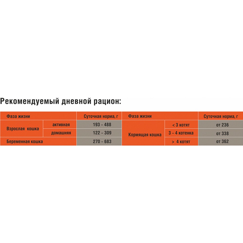 Протеин — 6,0 г, Жир — 3,5 г, Зола — не более 2,5 г, Клетчатка — не более 0,3 г, Влага — 84%, Кальций — не менее 0,2 г, Фосфор — не менее 0,15 г.