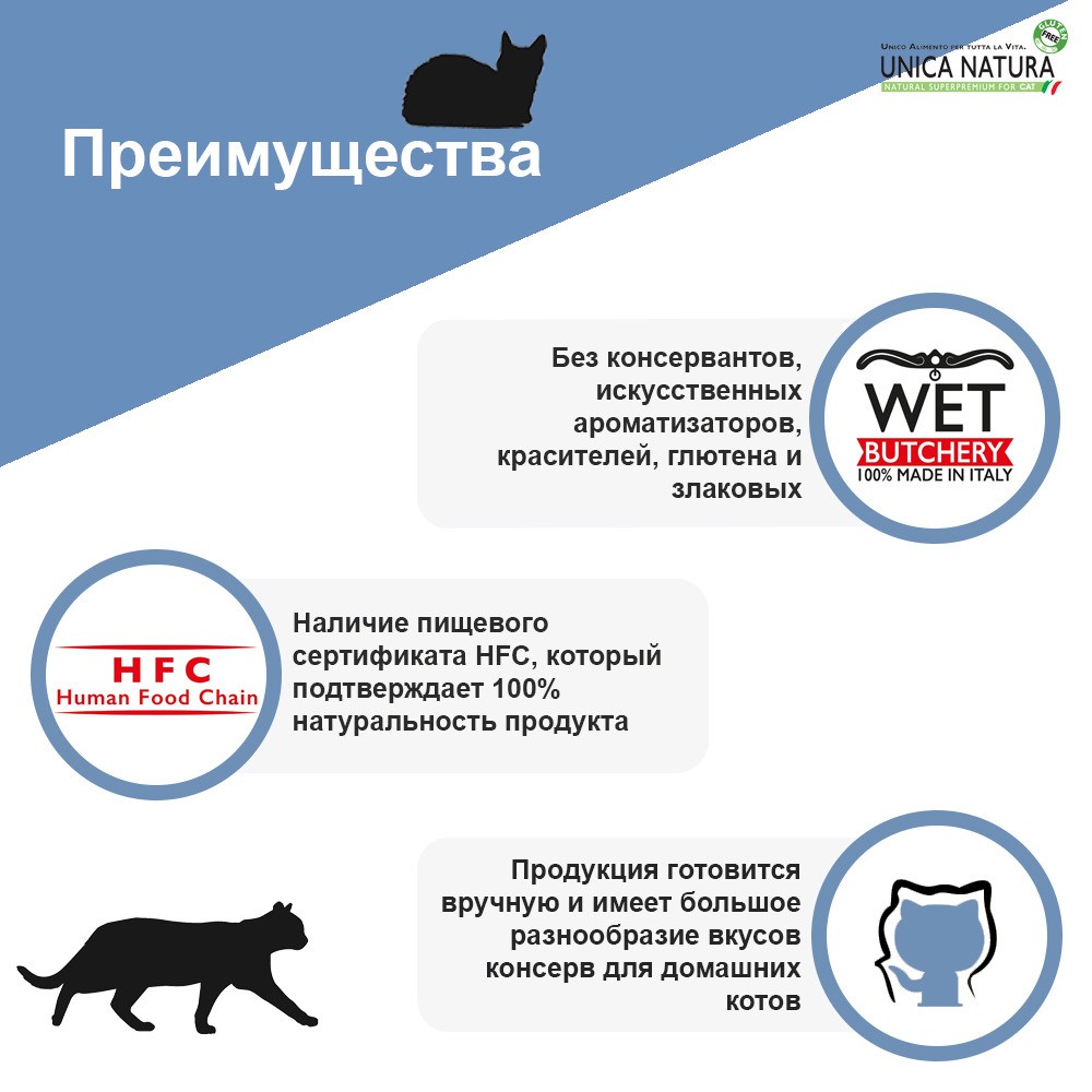 Unica Natura использует уникальные продуктовые и вкусовые сочетания, которые привлекают кошек, не добавляя ароматизаторы и усилители вкуса.