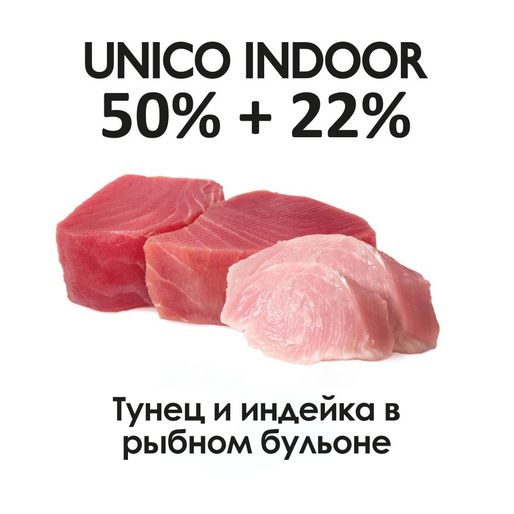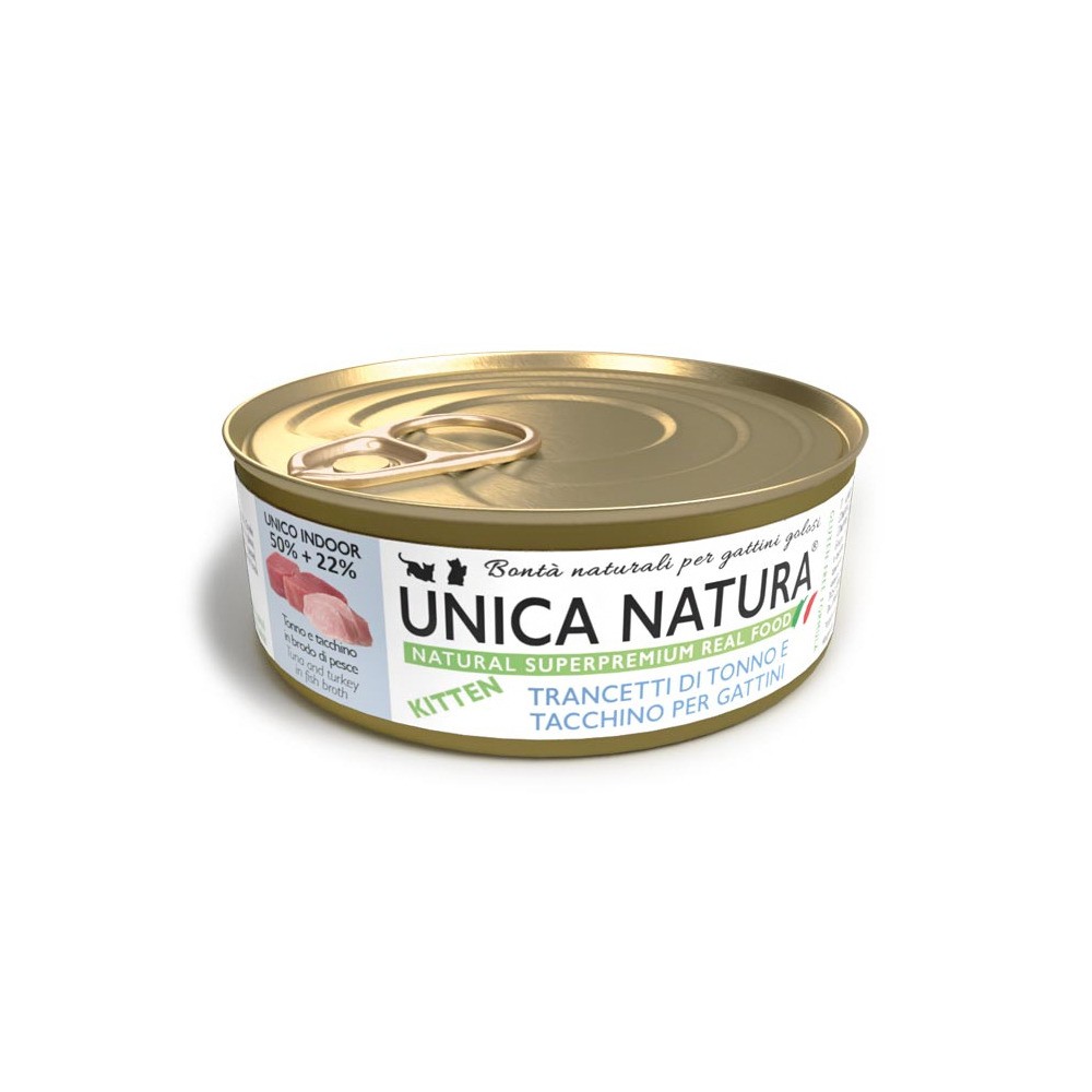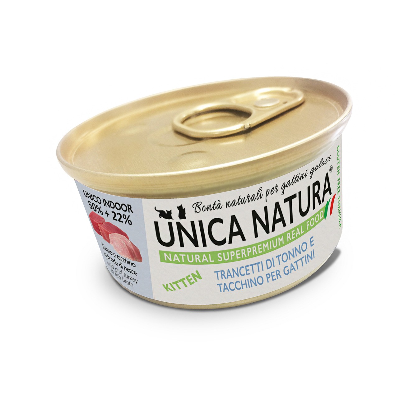 Влажный корм Unica Natura с тунцом и индейкой для котят на рыбном бульоне без загустителей. Приготовлен в Италии вручную. 100% натуральный продукт без добавок и денатураторов. Линейка продукции