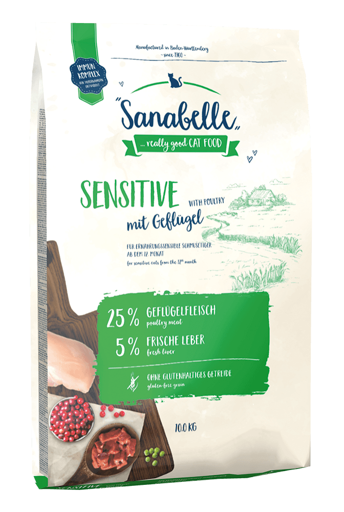 Bosch Sanabelle Sensitive with Poultry — это сухой корм для взрослых кошек супер премиум класса с чувствительным пищеварением. Корм придает блеск шерсти и сохранят эластичность кожи, поддерживает