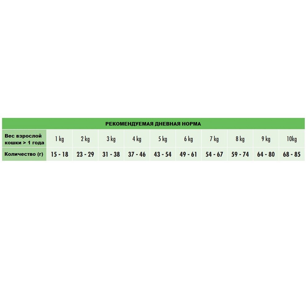 Злаки (цельное зерно 22 %), мясо и производные (белое мясо птицы 15 %), субпродукты растительного происхождения (сухой жом свеклы 1 %), масла и жиры, экстракты растительных белков, рыба и рыбные