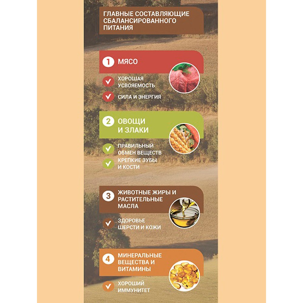 Злаки и продукты растительного происхождения, мясо и продукты животного происхождения (в том числе из говядины мин. 4%), животные жиры и растительные масла, натуральные вкусоароматические добавки,