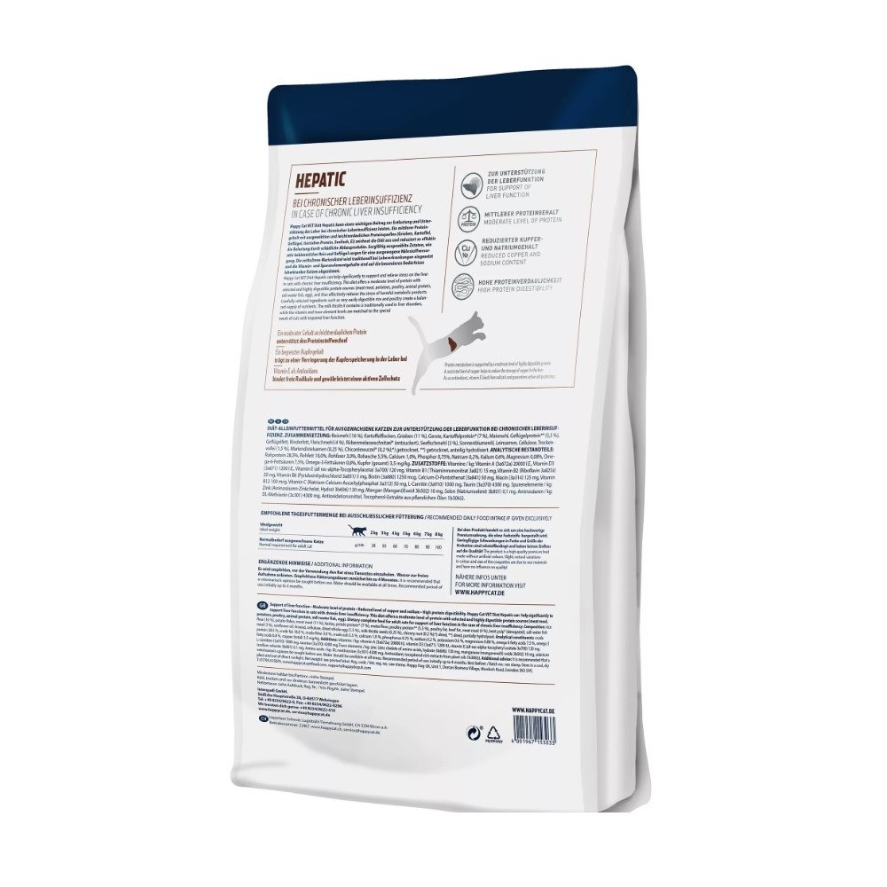 Happy Cat Vet Diet Hepatic — диетический полноценный корм для взрослых кошек для поддержки функции печени при хронической печеночной недостаточности. Эта диета предлагает умеренный уровень белка с
