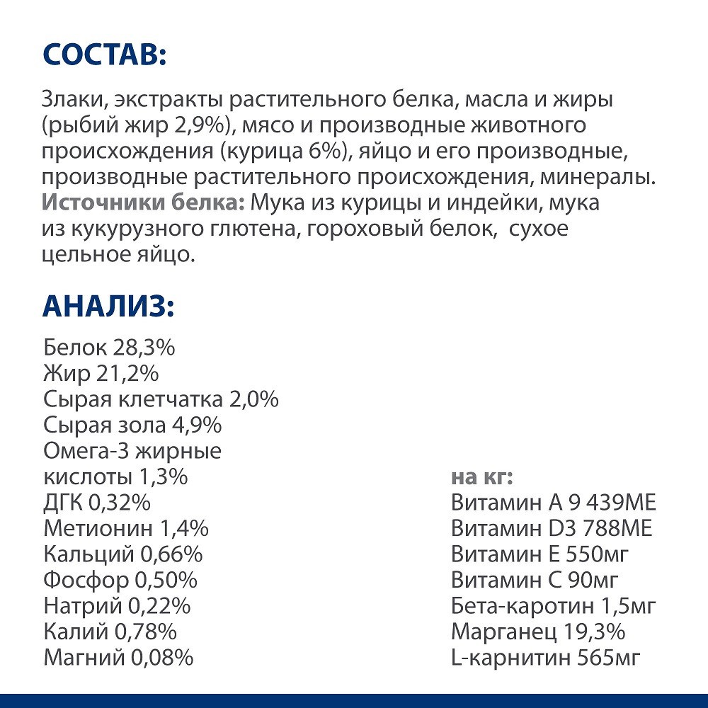 Злаки, экстракты растительного белка, масла и жиры (рыбий жир 2,9%), мясо и производные животного происхождения (курица 6%), яйцо и его производные, производные растительного происхождения,