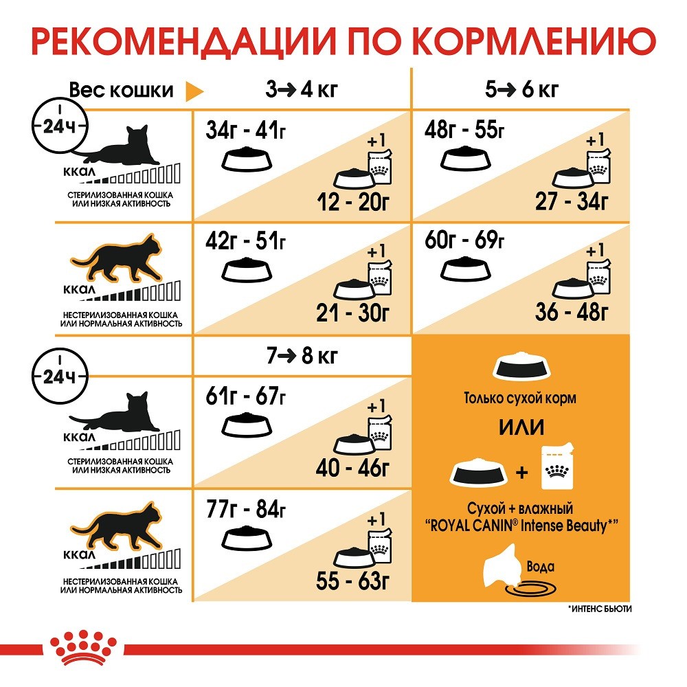 содержание протеинов (40 %) и умеренное количество жиров (18 %) способствуют поддержанию мышечной массы. - Здоровая блестящая шерсть: Специальный комплекс аминокислот, витаминов, жирных кислот Омега 3 и Омега 6 сохраняет здоровье кожи и блеск шерсти. Отличительной чертой окраса бенгальской кошки