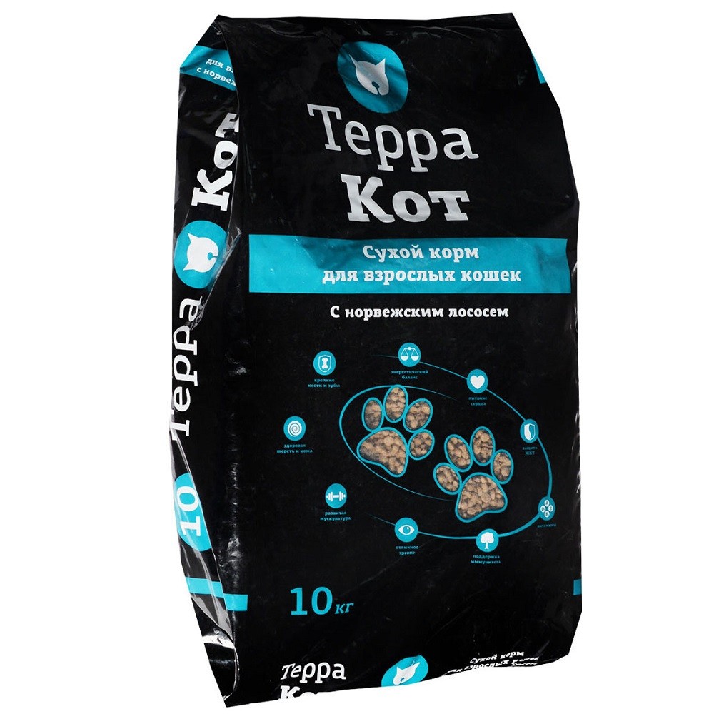 Корм «Терра Кот» — это сухой корм для взрослых кошек с норвежским лососем.