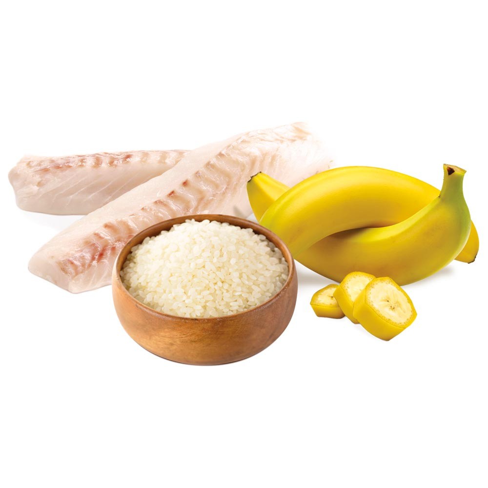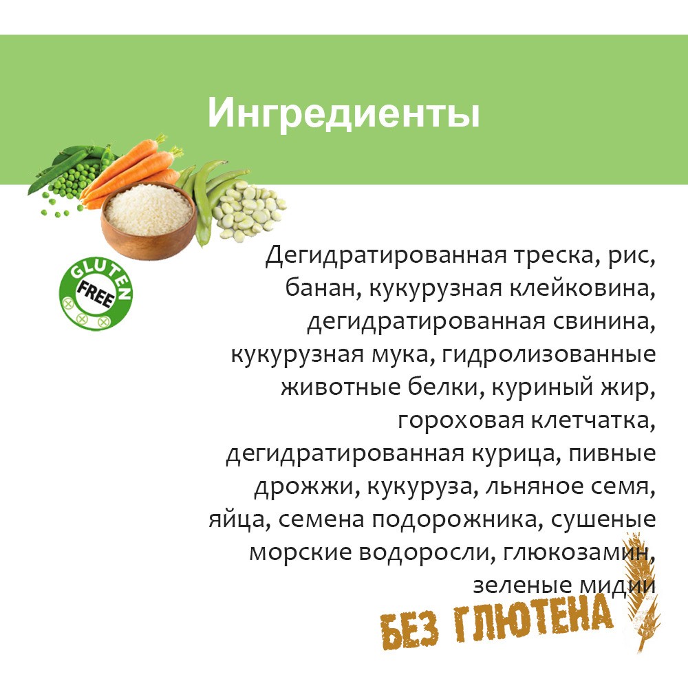 Дегидратированная треска (15,17%), рис (13,14%), банан (0,30%), кукурузная клейковина, дегидратированная свинина, кукурузная мука, гидролизованные животные белки, куриный жир, гороховая клетчатка,