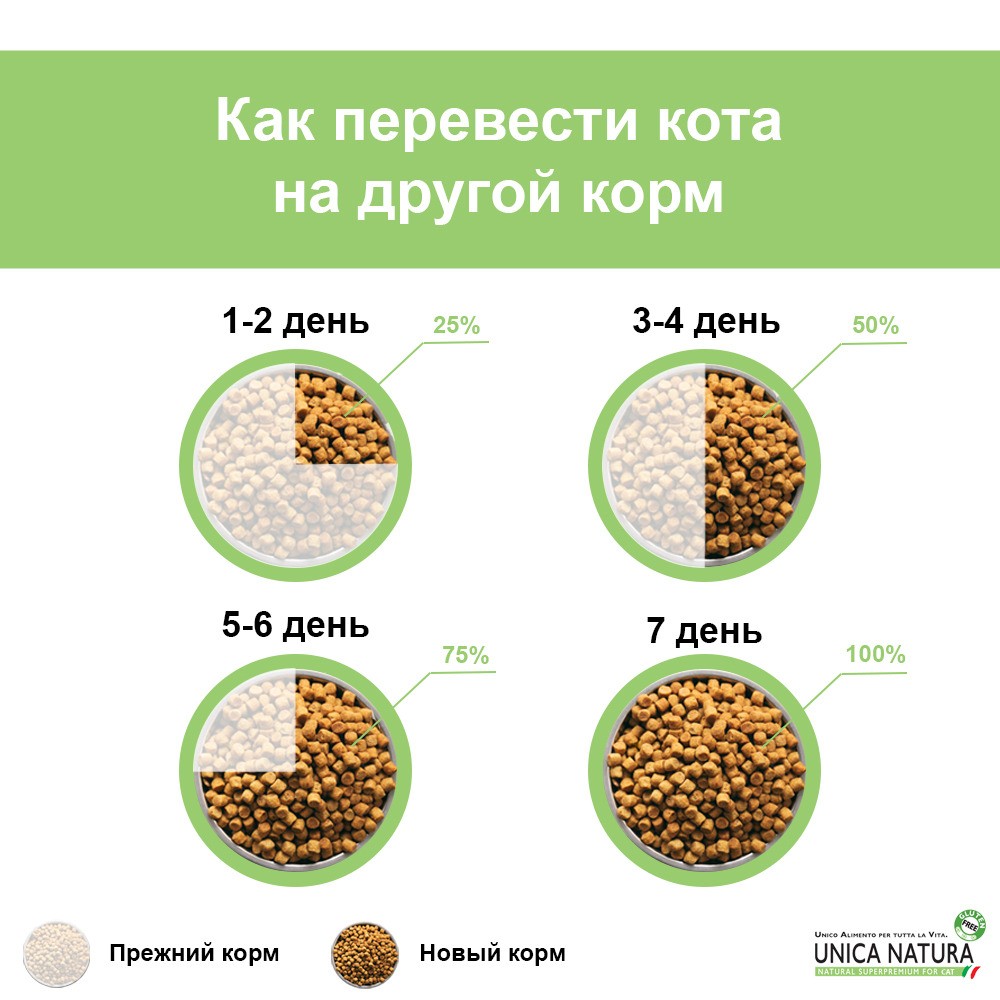 Одним из преимуществ Unica Natura является лёгкий переход на данный корм без стресса и пищевых расстройств. Достаточно в течение 7 дней увеличивать содержание нового корма по отношению к прежнему.