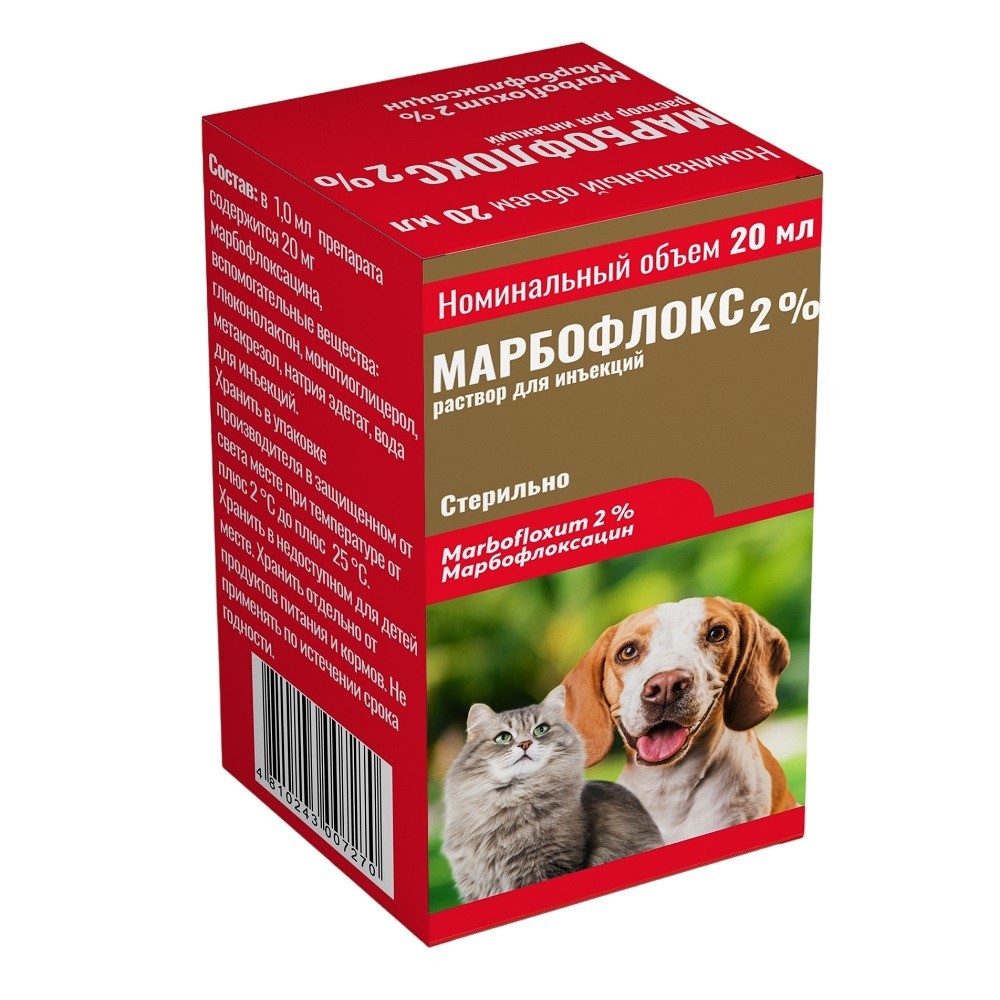 Марбофлокс 2 % – антибкактериальный препарат, применяют собакам, кошкам, телятам и свиньям при стафилококкозе, стрептококкозе, колибактериозе, сальмонеллезе, псевдомонозе, пастереллезе,